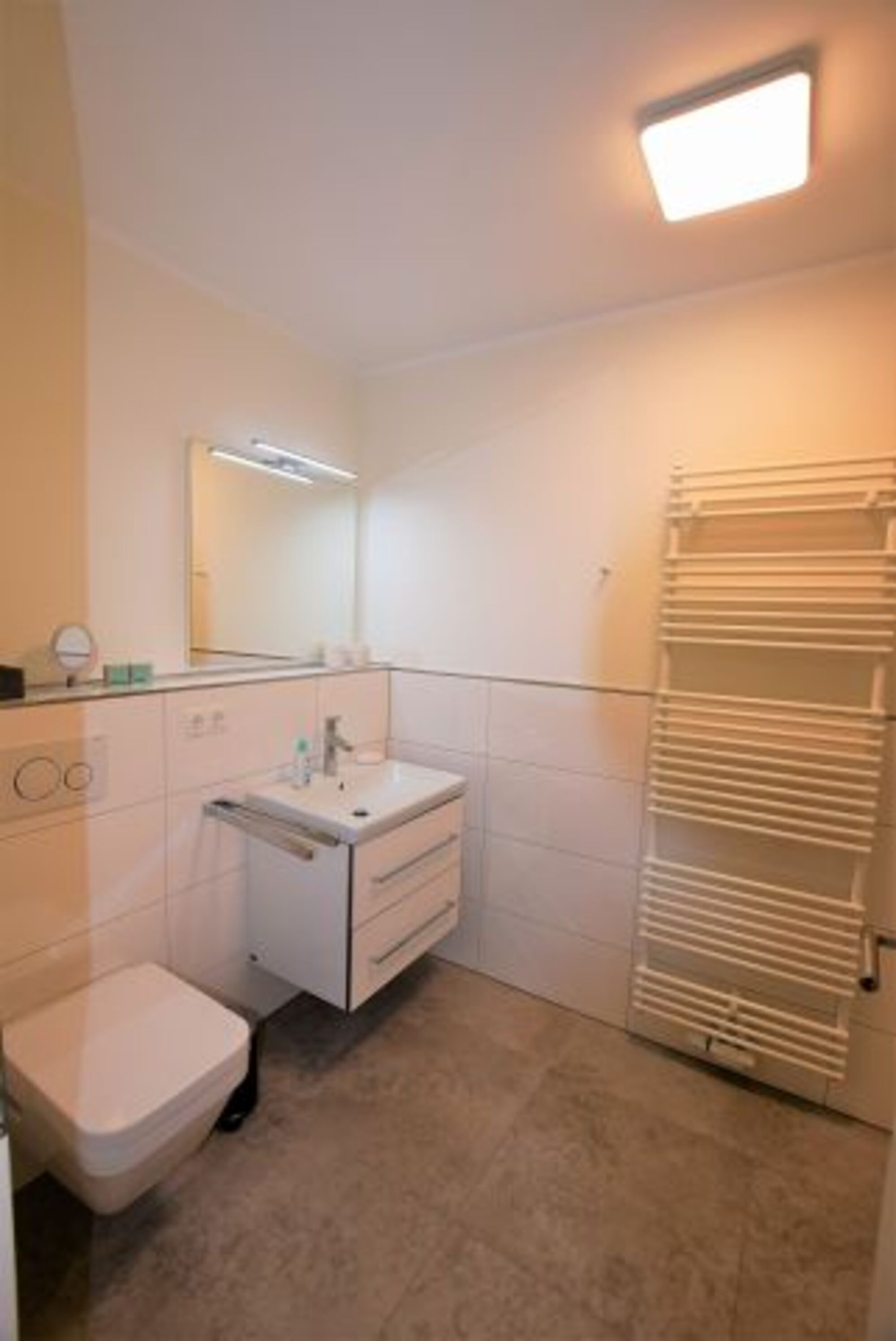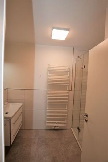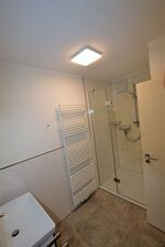 Der Flur verfügt über einen eingebauten Garderobenschrank mit großem Spiegel. Das moderne Duschbad ist hell gefliest und mit Waschtisch, Unterschrank, einem beleuchteten Spiegel, Fön und Handtuchwärmer ausgestattet.
