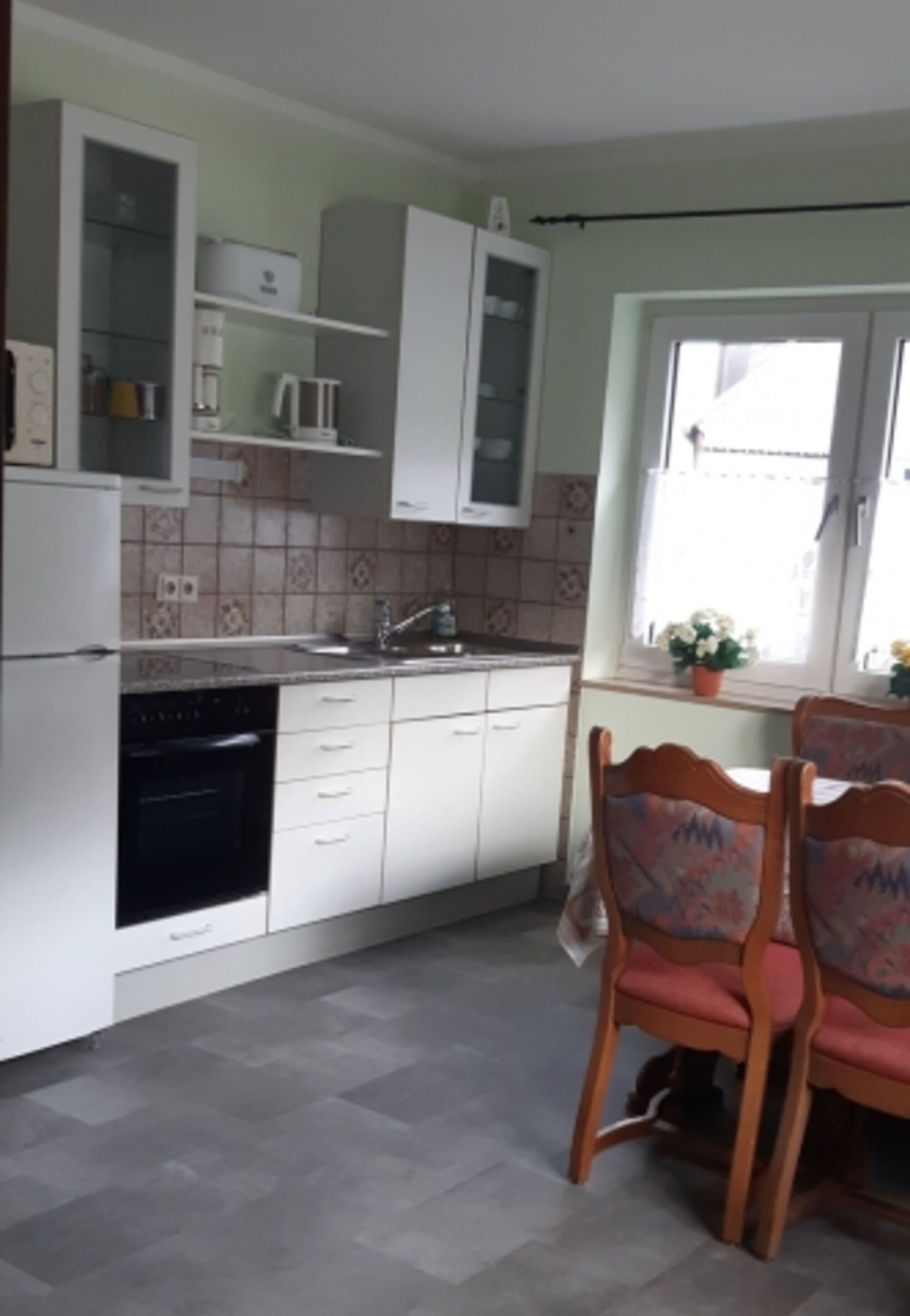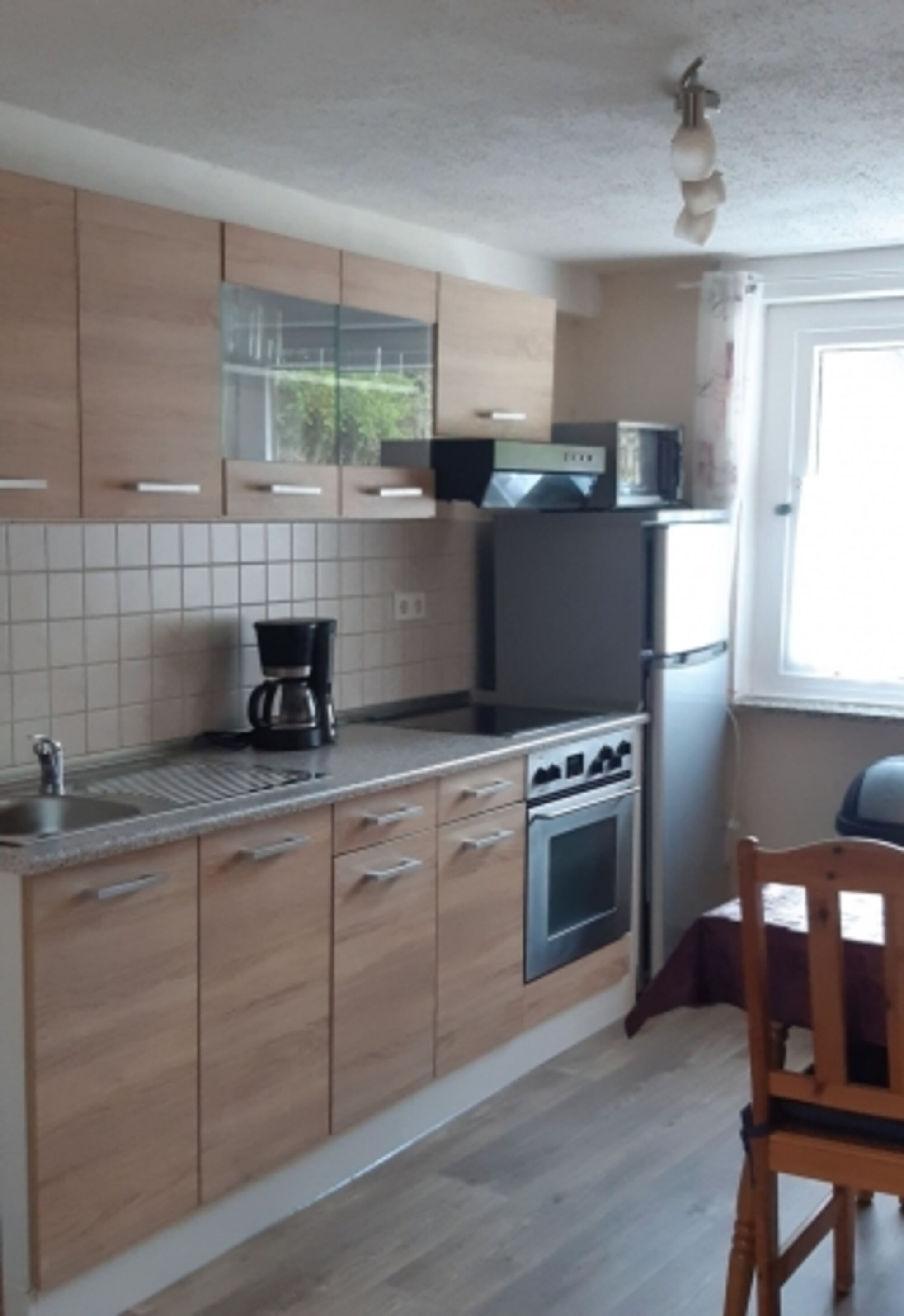 4-Platten Herd, Cerankochfeld, Dunstabzugshaube, Kühlschrank mit Gefrierfach, Eierkocher, Mixer, Geschirrhandtücher, Essplatz in der Küche
