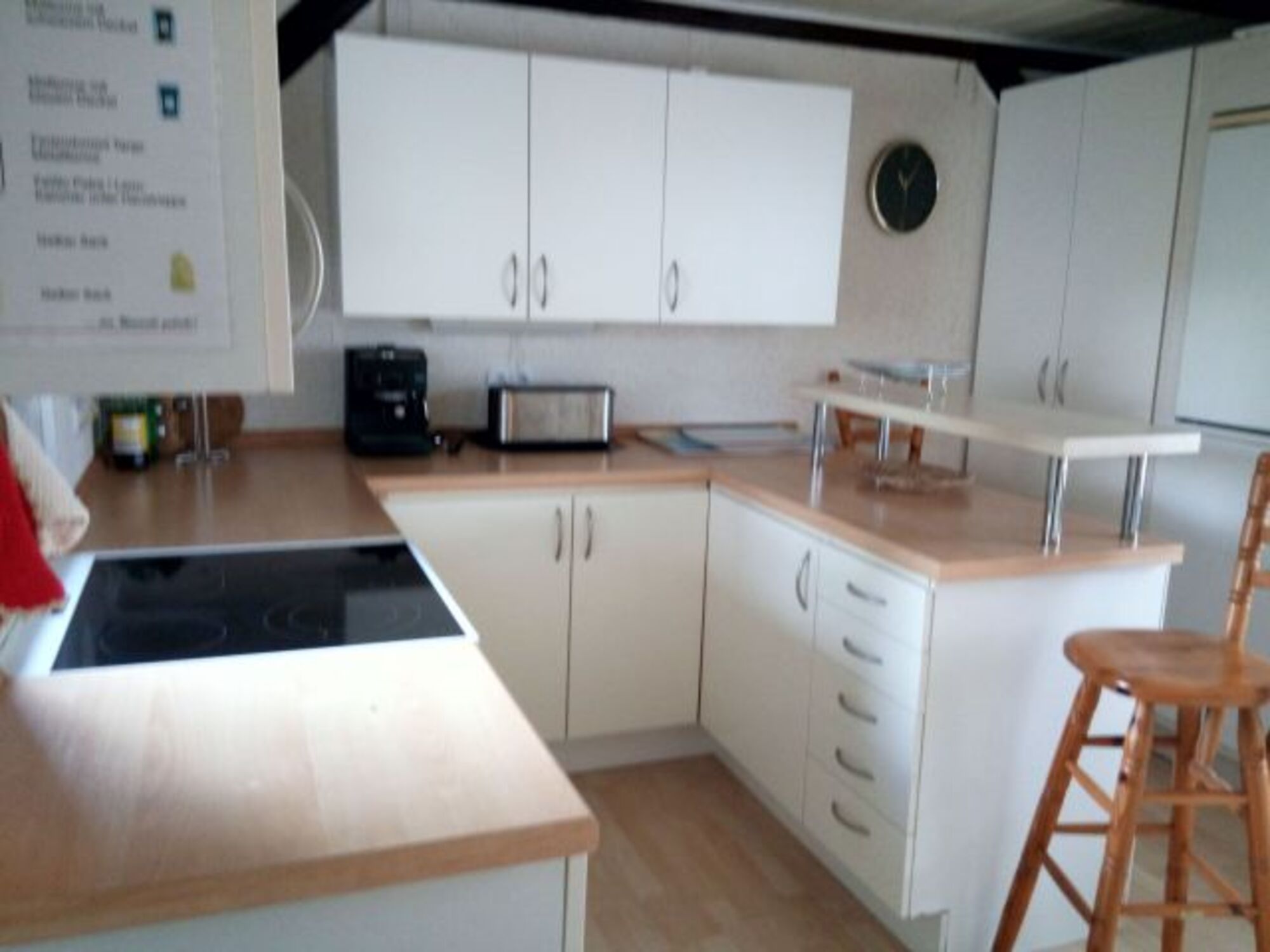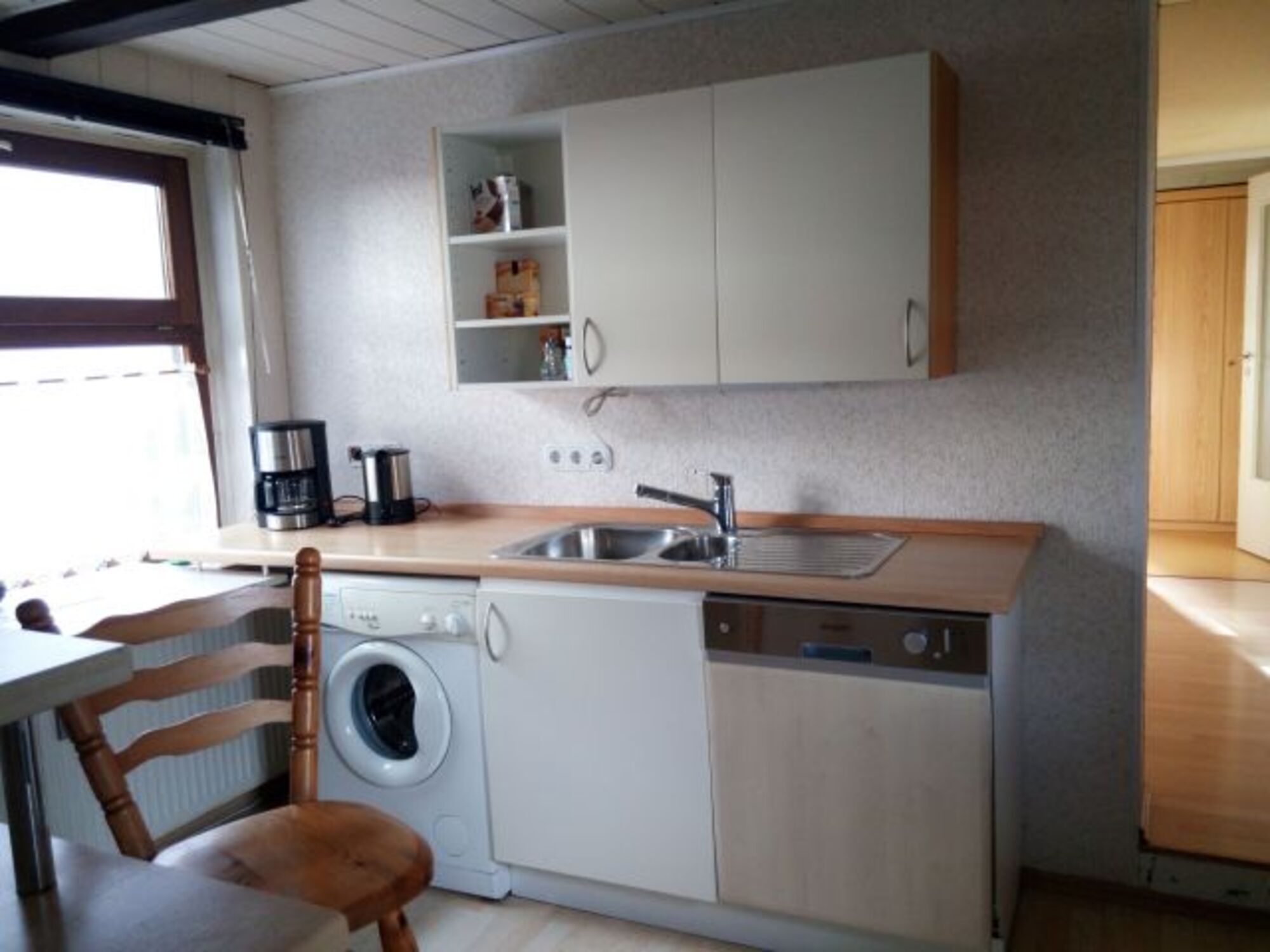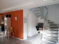 komplett ausgestattete Küche: Gläser und Geschirr für 12 Personen, Geschirrspülmaschine, Ceranglas-Kochfeld mit Heißluftherd, Mikrowelle, Kühlschrank, Kaffeemaschine, Wasserkocher, Toaster, Expressoautomat, Waschmaschine, zweiter Eingang bei der Küche, offenes Treppenhaus.