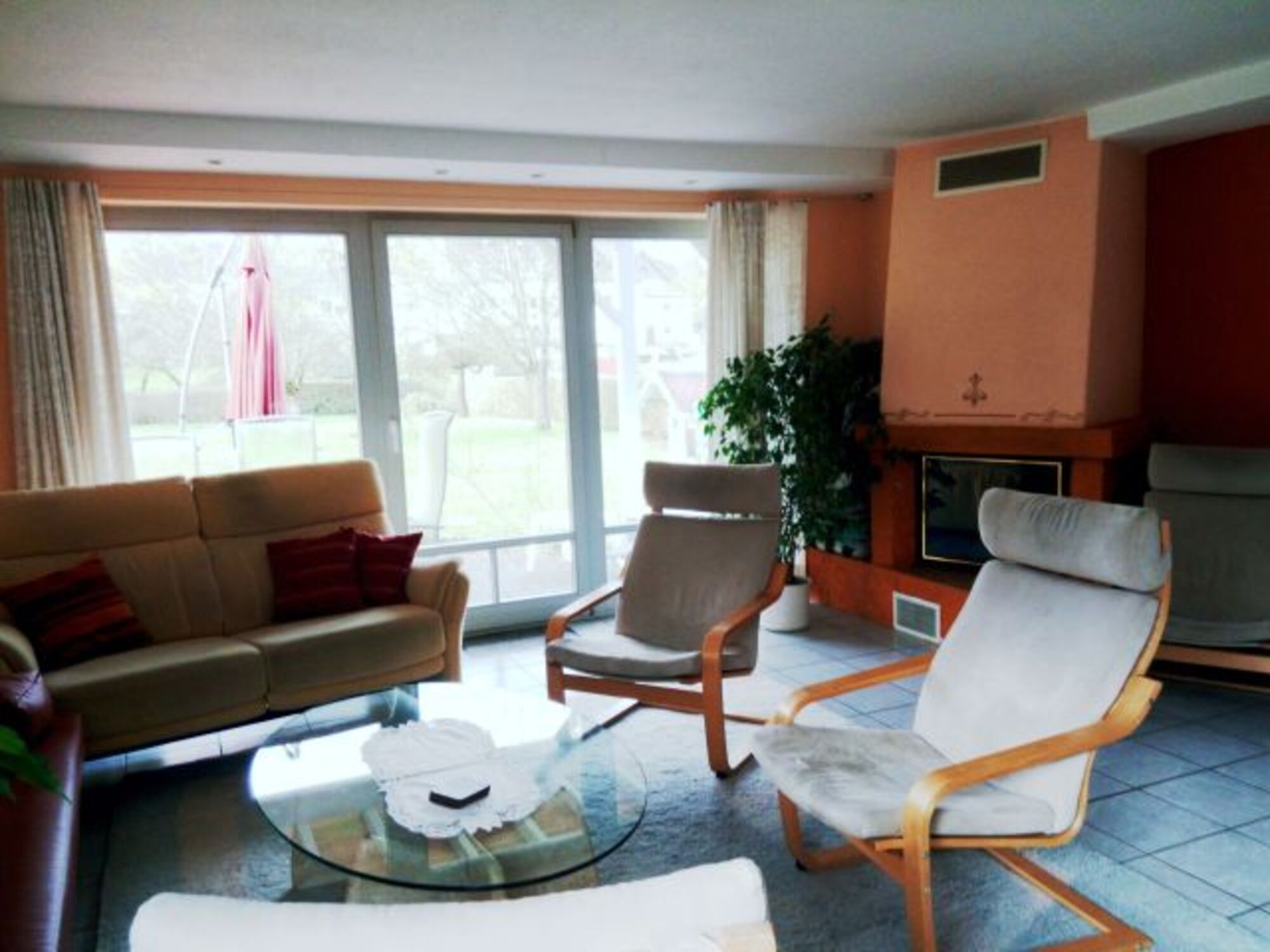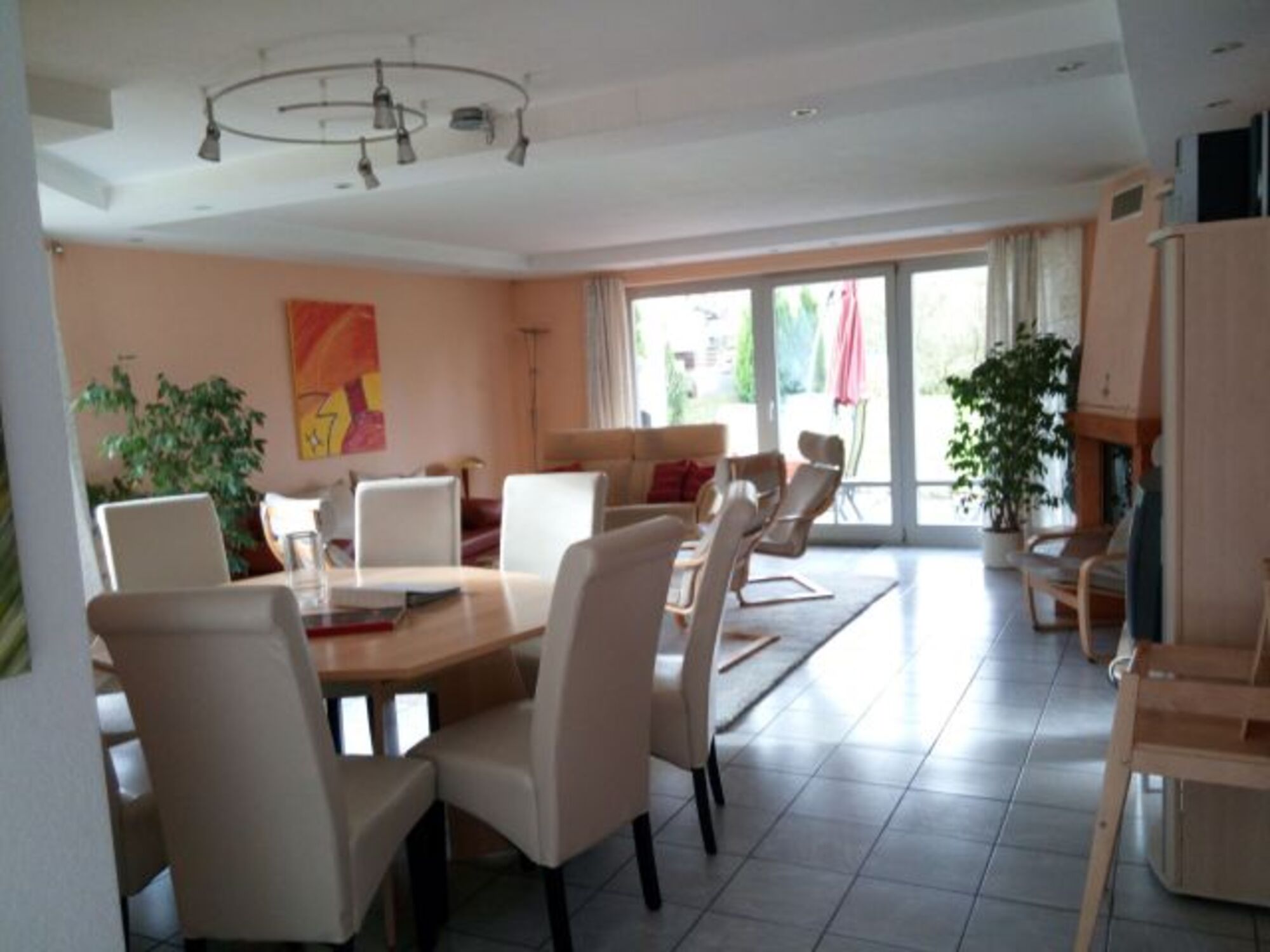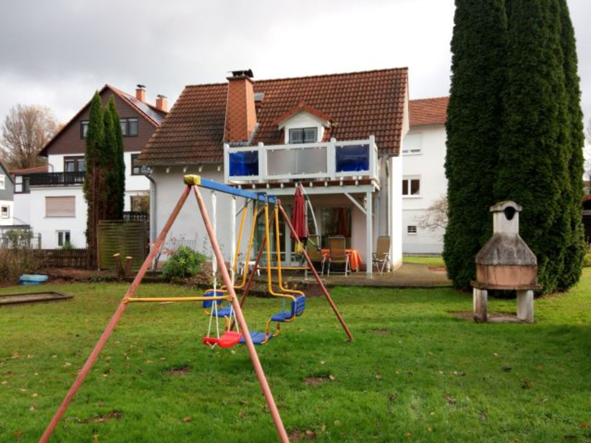 große, teilweise überdachte Terrasse direkt vor dem Wohnzimmer (Süd-Westseite). Weitere Sitzmöglichkeiten vor dem Hauseingang, vor der Küche und auf dem Balkon vor dem Schlafzimmer.