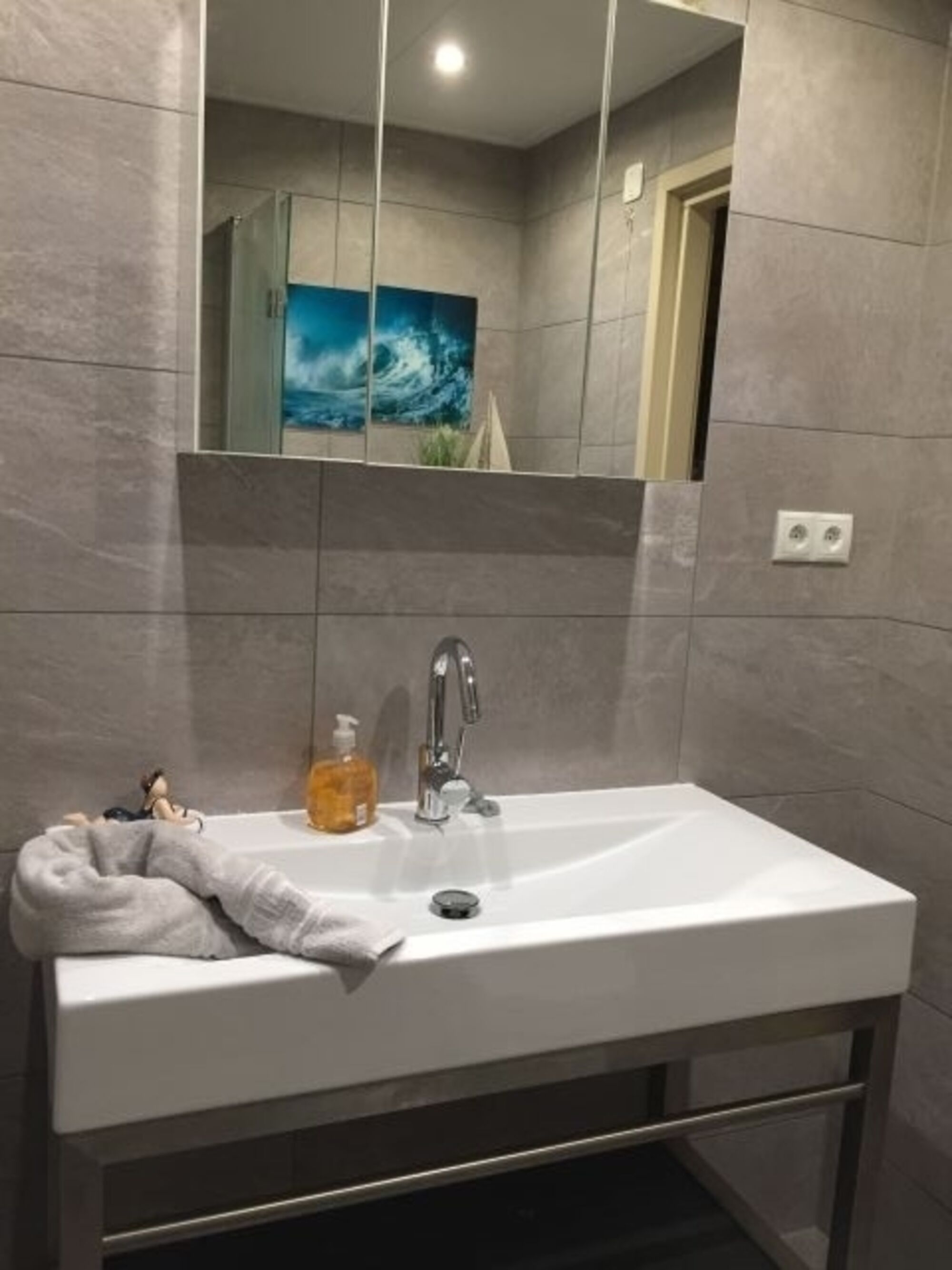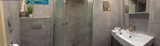 Das modere Badezimmer verfügt über eine ebenerdige Dusche.