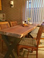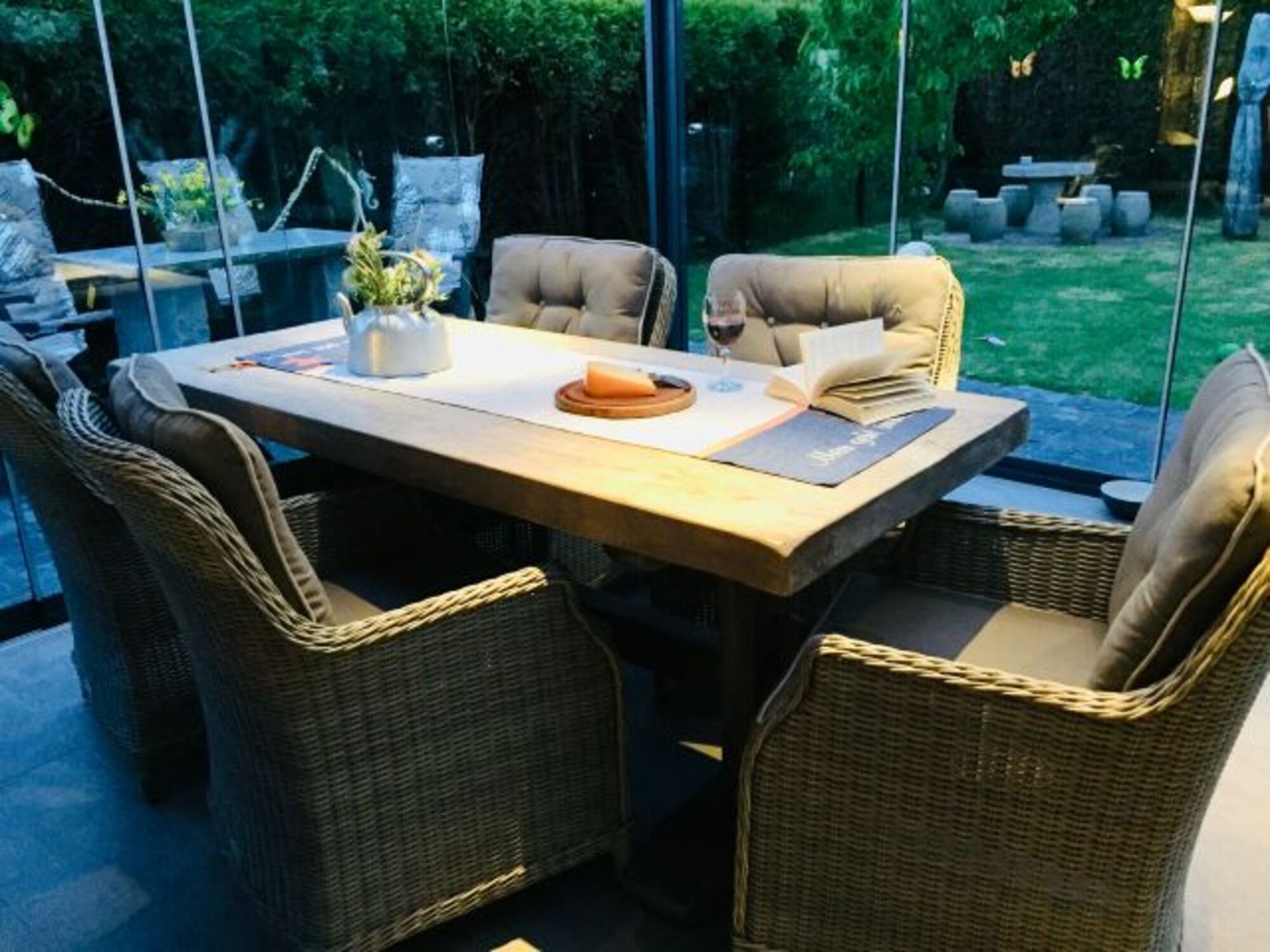 Im Wintergarten steht Ihnen eine weitere hochwertige Sitzmöglichkeit mit Polyrattan Sessel an einer alten Klostertafel zur Verfügung.