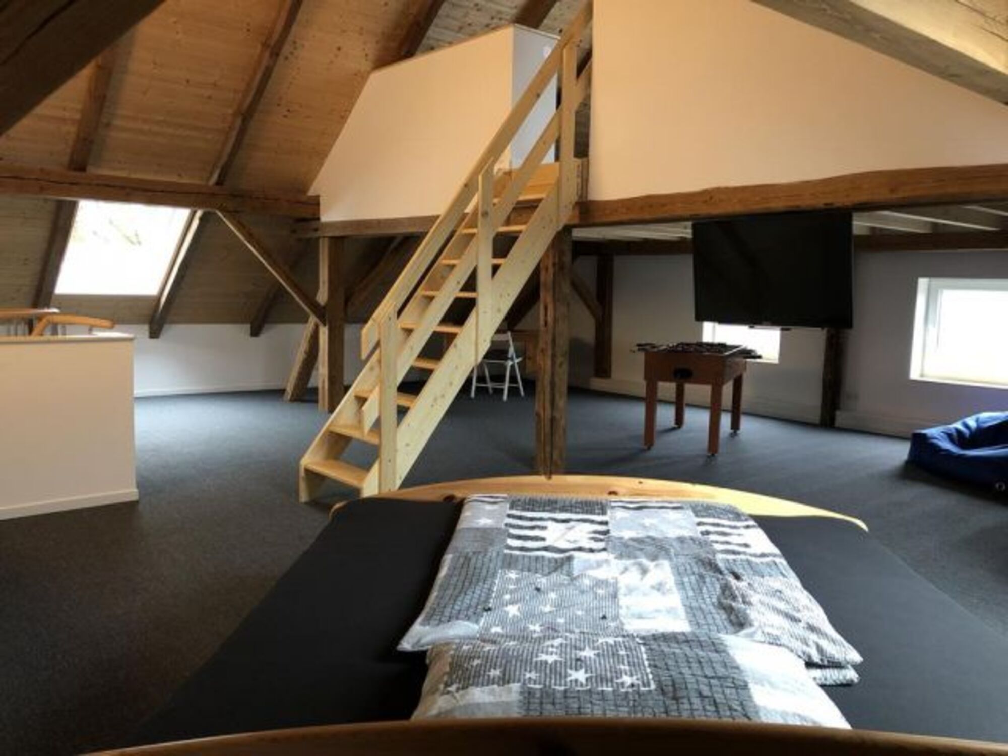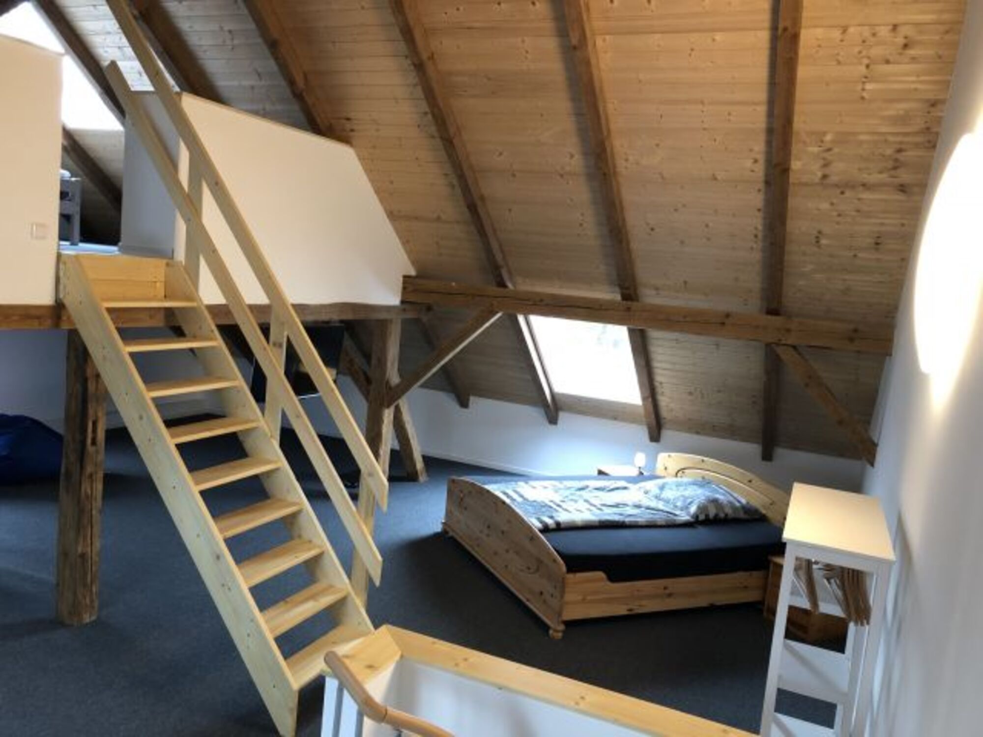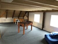 Der Zugang zum 2. Schlafzimmer erfolgt über eine Wendeltreppe. Hier ist ein offener Freizeit-/ Spielbereich für Kinder unterhalb der Empore von ca. 30 qm vorhanden. Dieser lädt zum Kickern, Wii-Spielen (Spiele vorhanden), Fernsehen oder einfach nur zum Lesen oder Chillen ein. Doppelbett 1,80 x 2,00m, Kommode, Leselampe am Bett