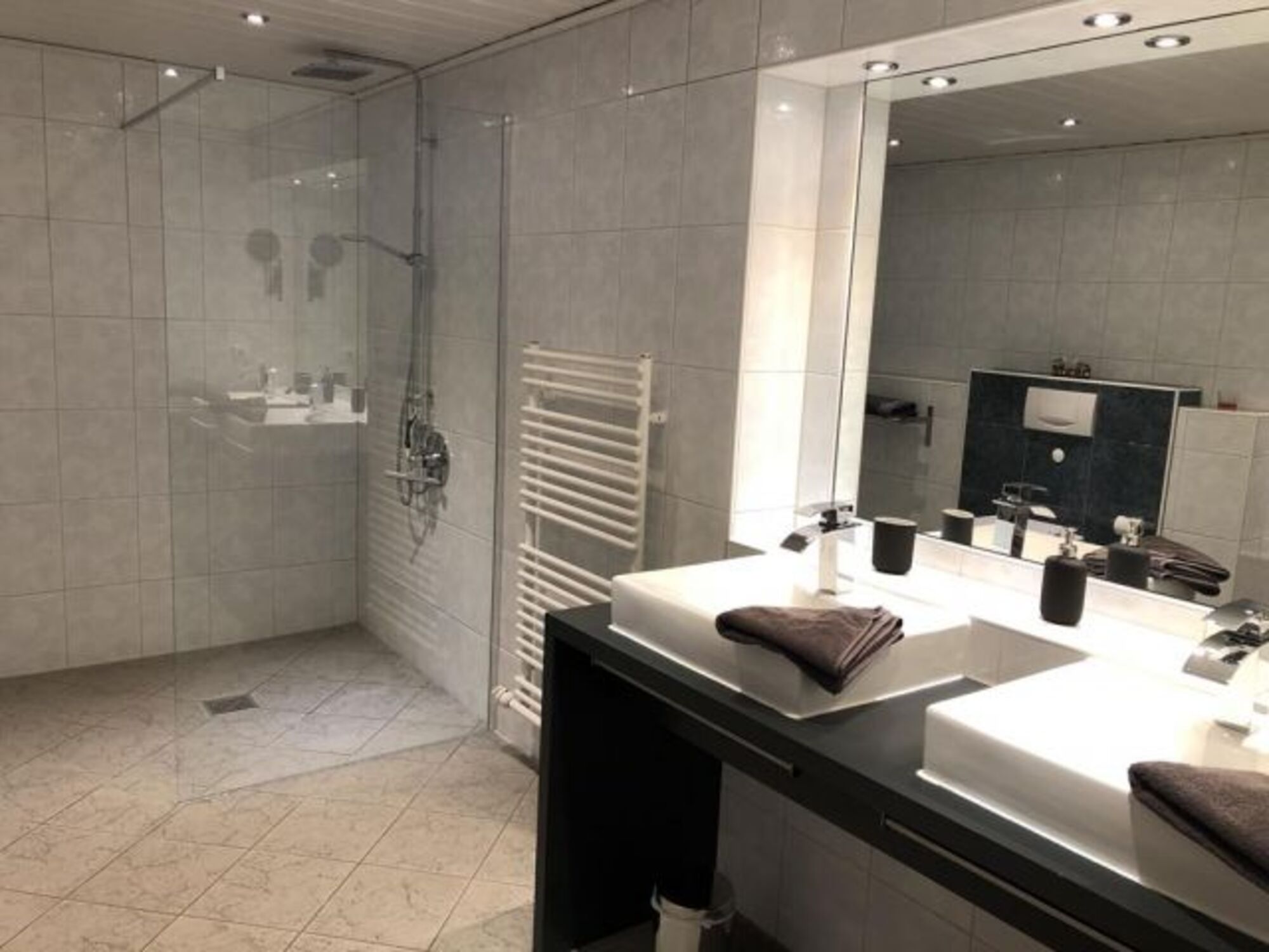 Doppelwaschbecken, Regendusche, Spiegel