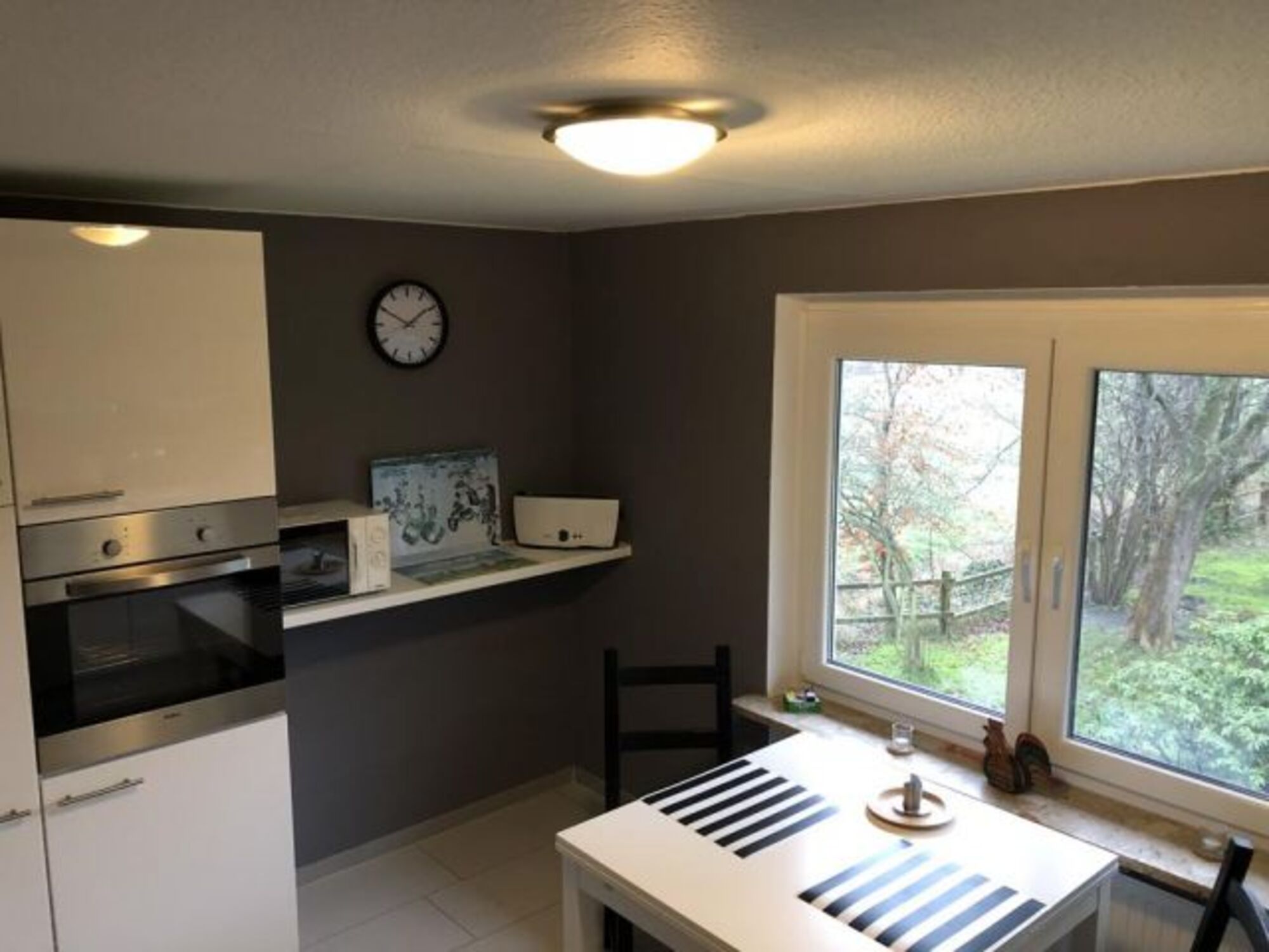 Genießen Sie in der voll ausgestattete Küche nicht nur das Zubereiten Ihrer Speisen sondern auch einen herrlichen Ausblick auf Ihren Garten. Ein Tisch und 2 Stühle (erweiterbar auf 4) gibt Ihnen die Möglichkeit auch hier zu Essen oder auch nur bei einem Kaffee Ihren Hund im Garten zu beobachten.
