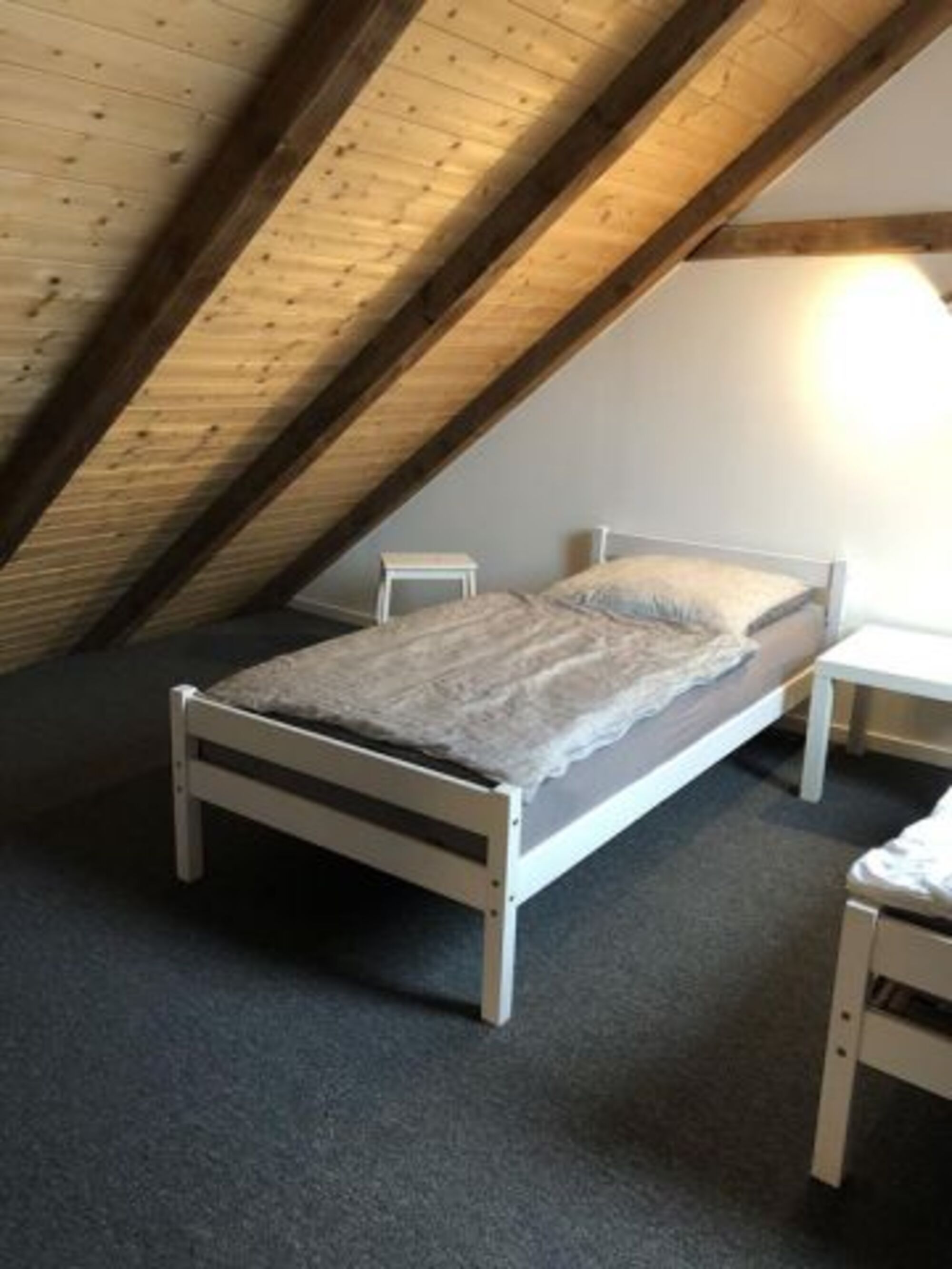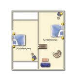 Die Schlafräume erstrecken sich über zwei Etagen. Ein Schlafzimmer befindet sich im 1. Obergeschoss, die weiteren 4 Schlafmöglichkeiten befinden sich im neu ausgebauten Dachgeschoss und sind über eine Wendeltreppe erreichbar. Diese Schlafbereiche sind mit einem Doppelbett und auf auf der offenen Schlafempore mit zwei Einzelbetten ausgestattet.