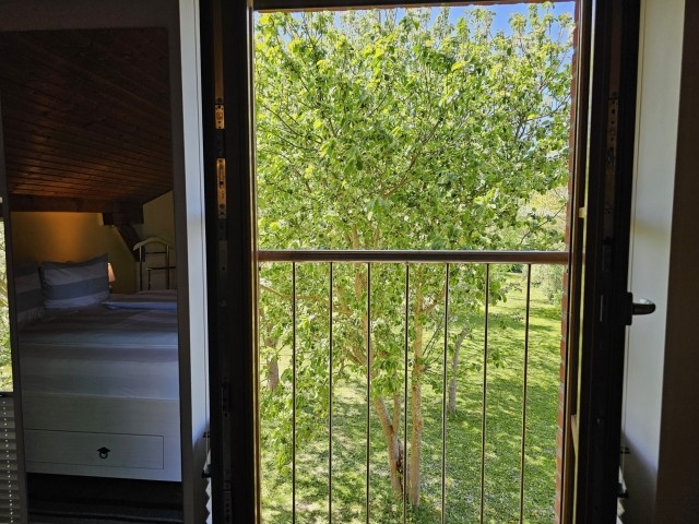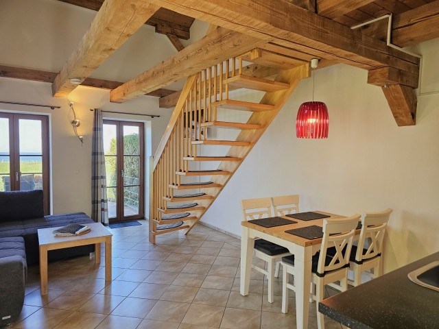 Die offene Balkendecke und die beiden Fensterfronten schaffen ein lichtdurchflutetes Raumerlebnis. Im Erdgeschoss erwartet Sie ein gemütlicher Wohn-Essbereich mit Schlafcouch (180x200) und Flachbildfernseher, dazu eine vollausgestattete Küche und ein Bad mit Dusche.
