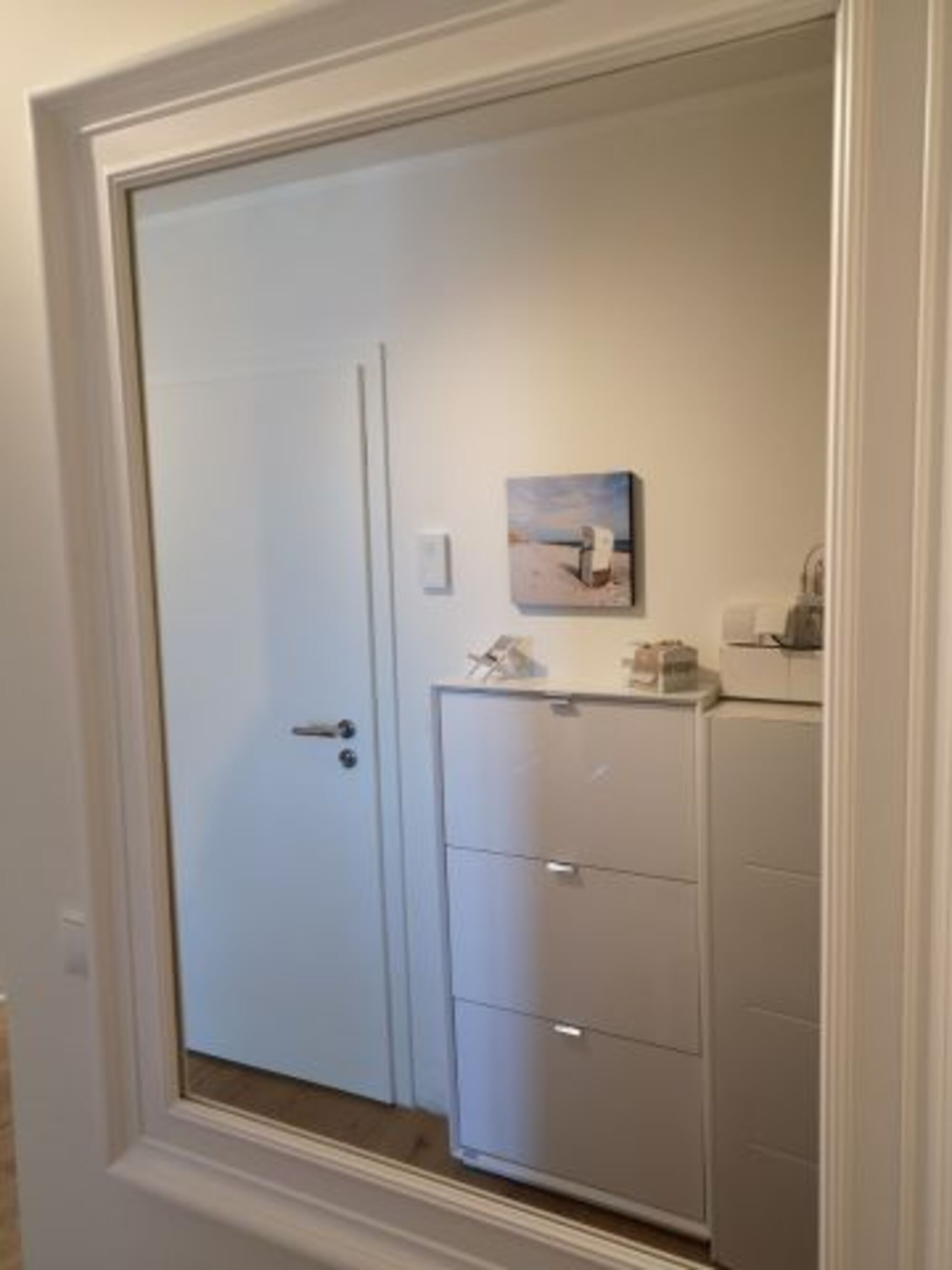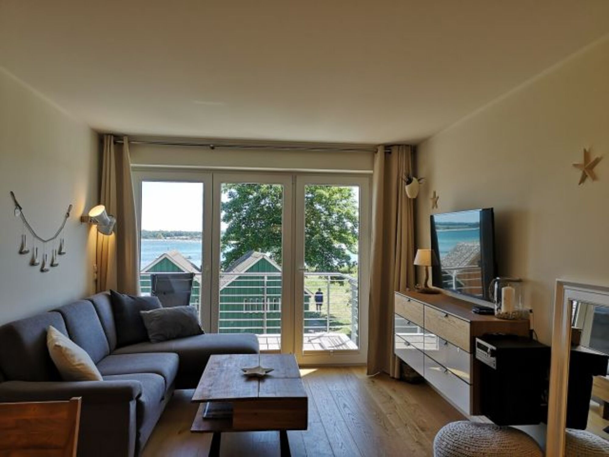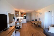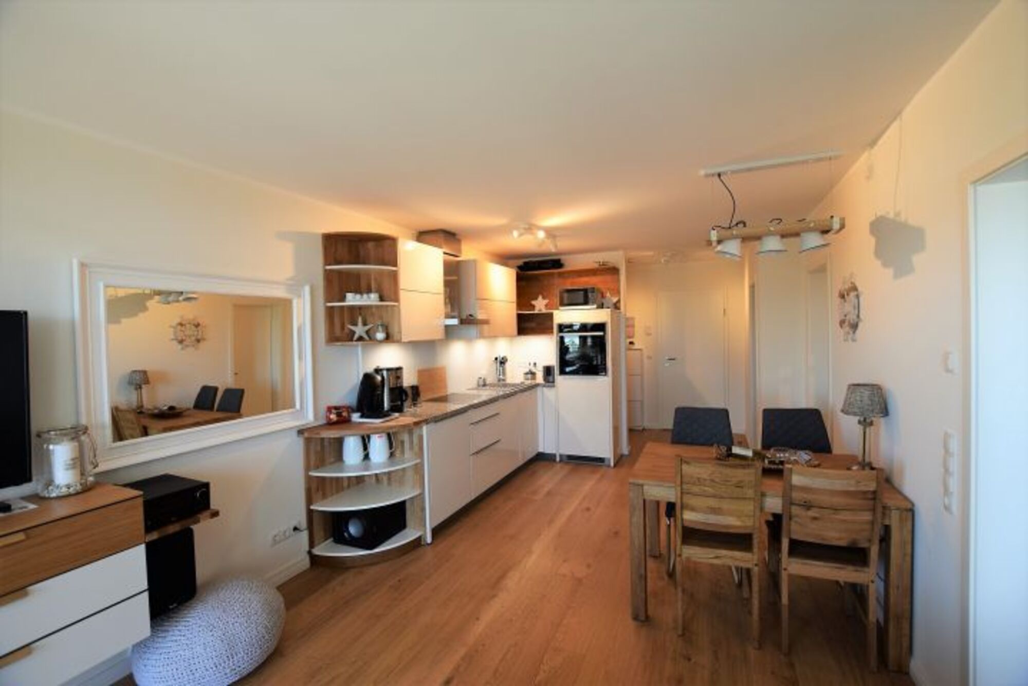 Die im 1. Stock gelegene Wohnung „Strandkörbchen“ bietet eine hochwertige Innenausstattung auf 52qm Wohnfläche mit Holzparkettboden, einer Fußbodenheizung und bodentiefen Fenstern.