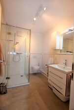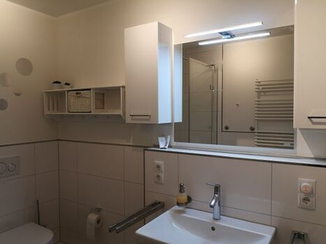 Das moderne Badezimmer mit hellen Fliesen ist geräumig. Die große Dusche ist bodentief und lässt sich mit einer Glastür verschließen. Ablagemöglichkeiten gibt es in ausreichender Zahl.