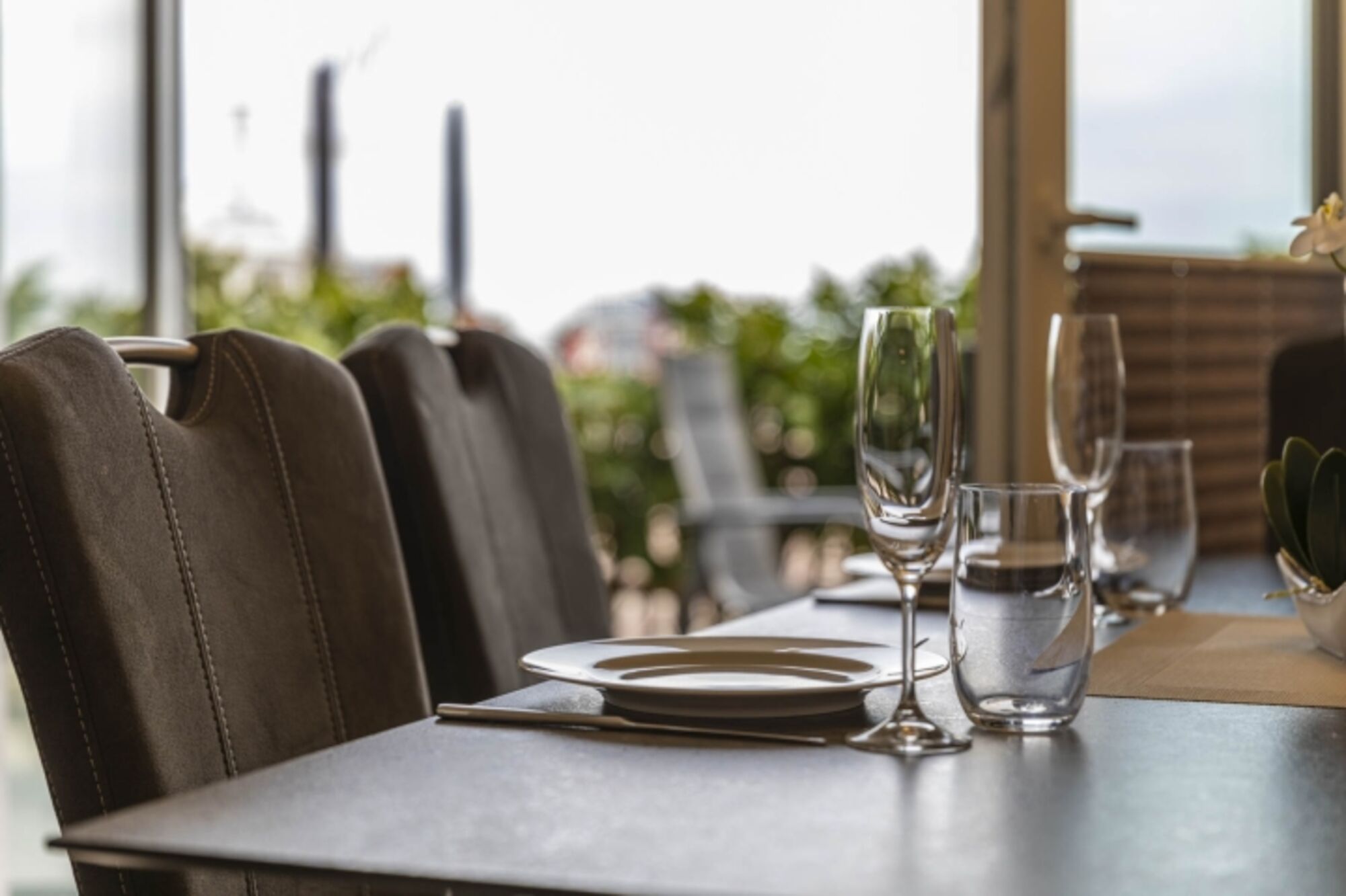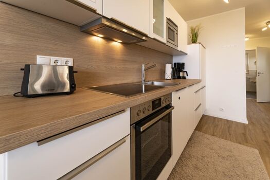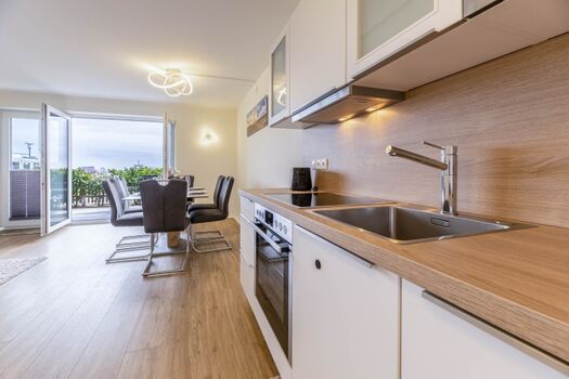 Am Esstisch können alle Gäste der Unterkunft zu gemeinsamen Mahlzeiten zusammenkommen. Direkt angrenzend befindet sich die offene Küche in modernem Design. Diese ist vollumfänglich ausgestattet und verfügt neben einem Geschirrspüler auch über einen Ceran- Herd mit Backofen, eine Mikrowelle, Kaffeemaschine, Wasserkocher, Toaster, einen Kühlschrank mit Gefriermöglichkeit und zahlreiche weitere Vorzüge.