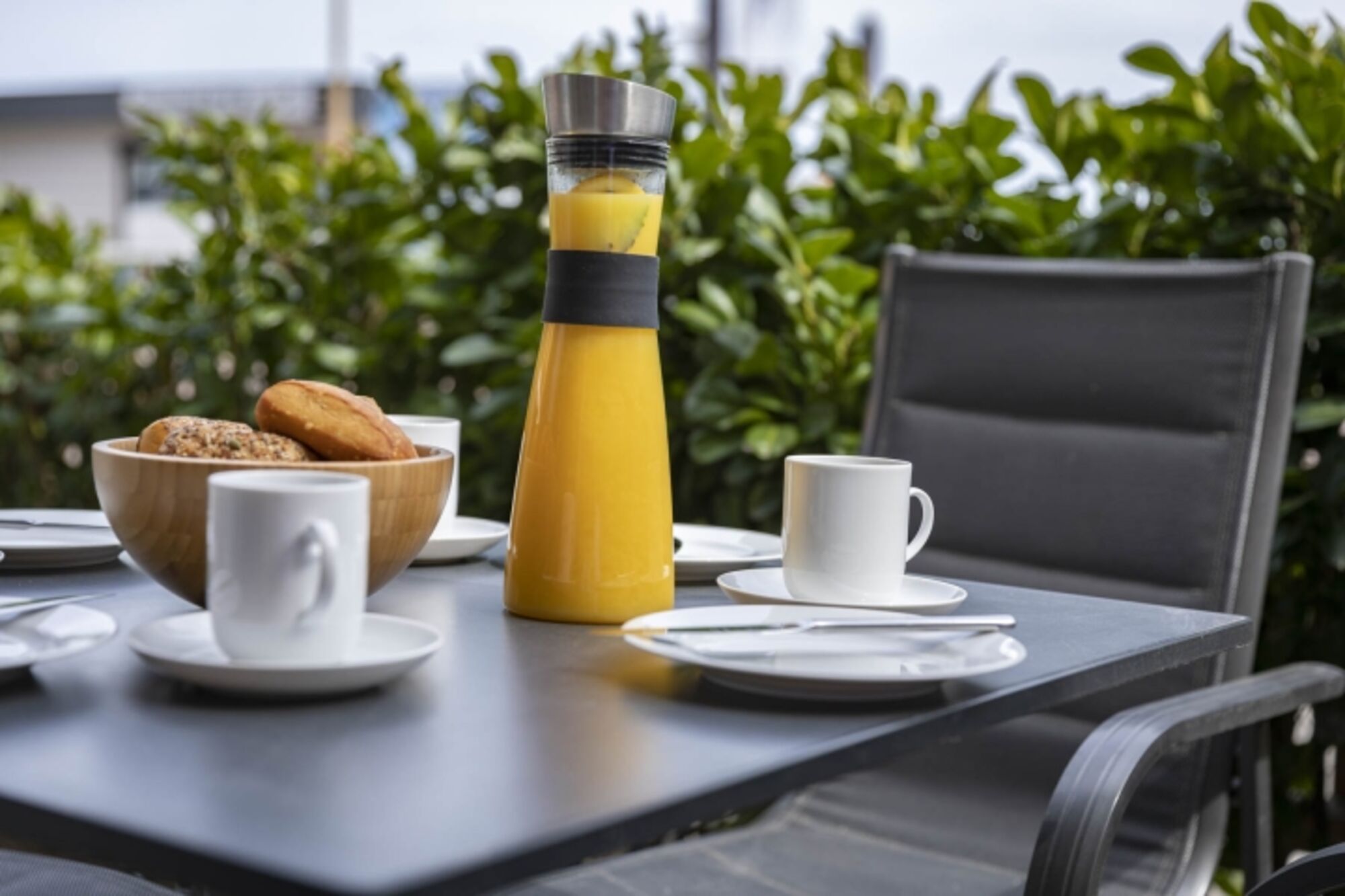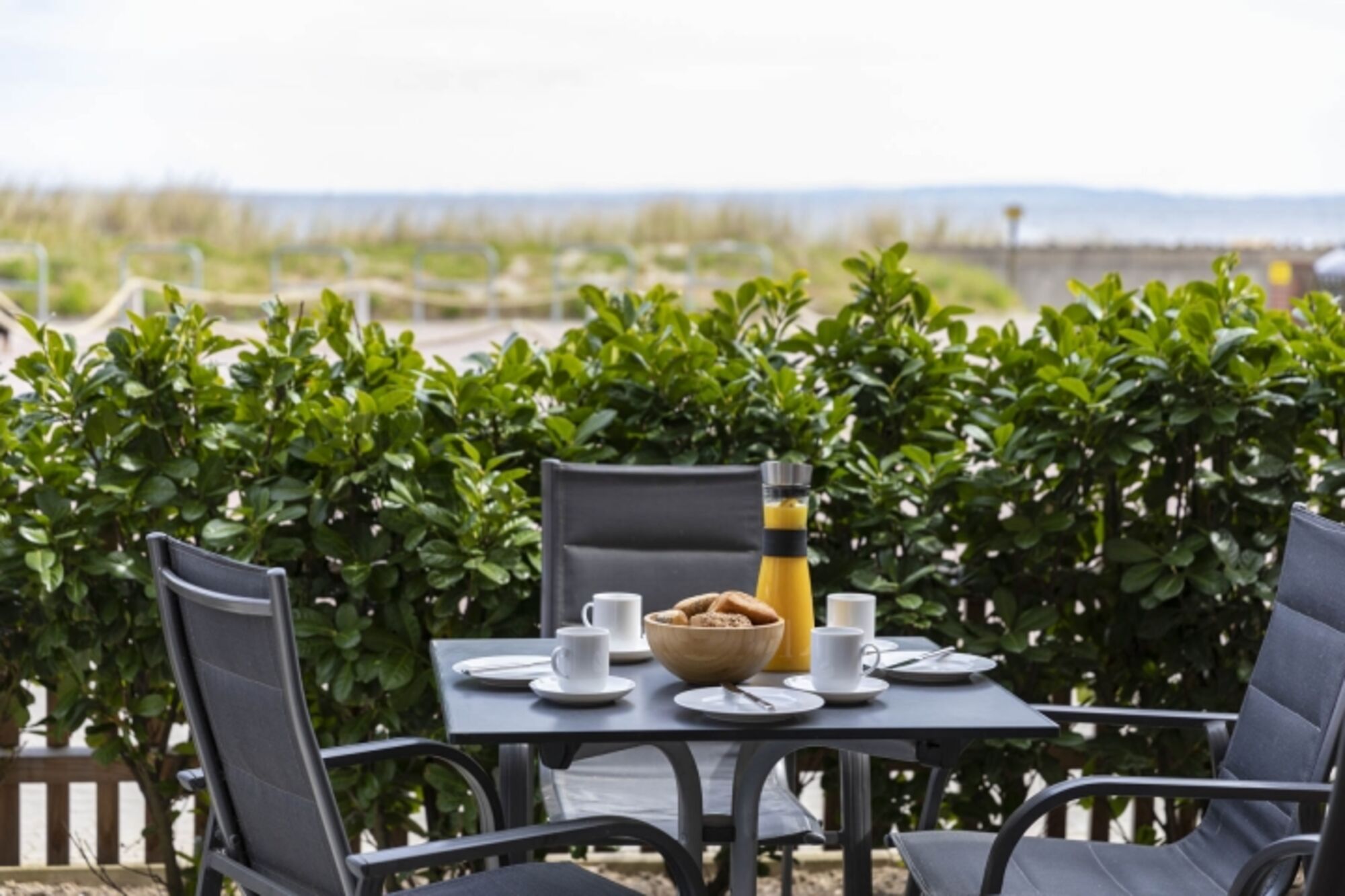 Zur Wohnung gehört eine nach Osten ausgerichtete Terrasse mit herrlichem Blick auf die Ostsee und ihre wunderschönen Sonnenaufgänge. Hier stehen Tisch und Stühle bereit, um die Zeit im Freien genießen zu können.