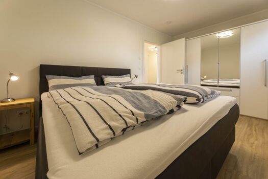 Die zwei Schlafzimmer mit großen Fenstern sind besonders hell,eines mit Doppelbett, das andere mit 2 Einzelbetten und geräumigem Kleiderschrank.