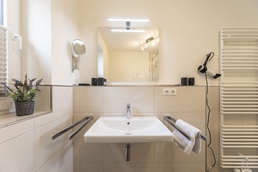Diese Unterkunft verfügt über ein Vollbad mit Waschtisch, Dusche und WC. Die Beleuchtung mit Deckenspots und der Handtuchhalter sorgen für modernen Komfort.