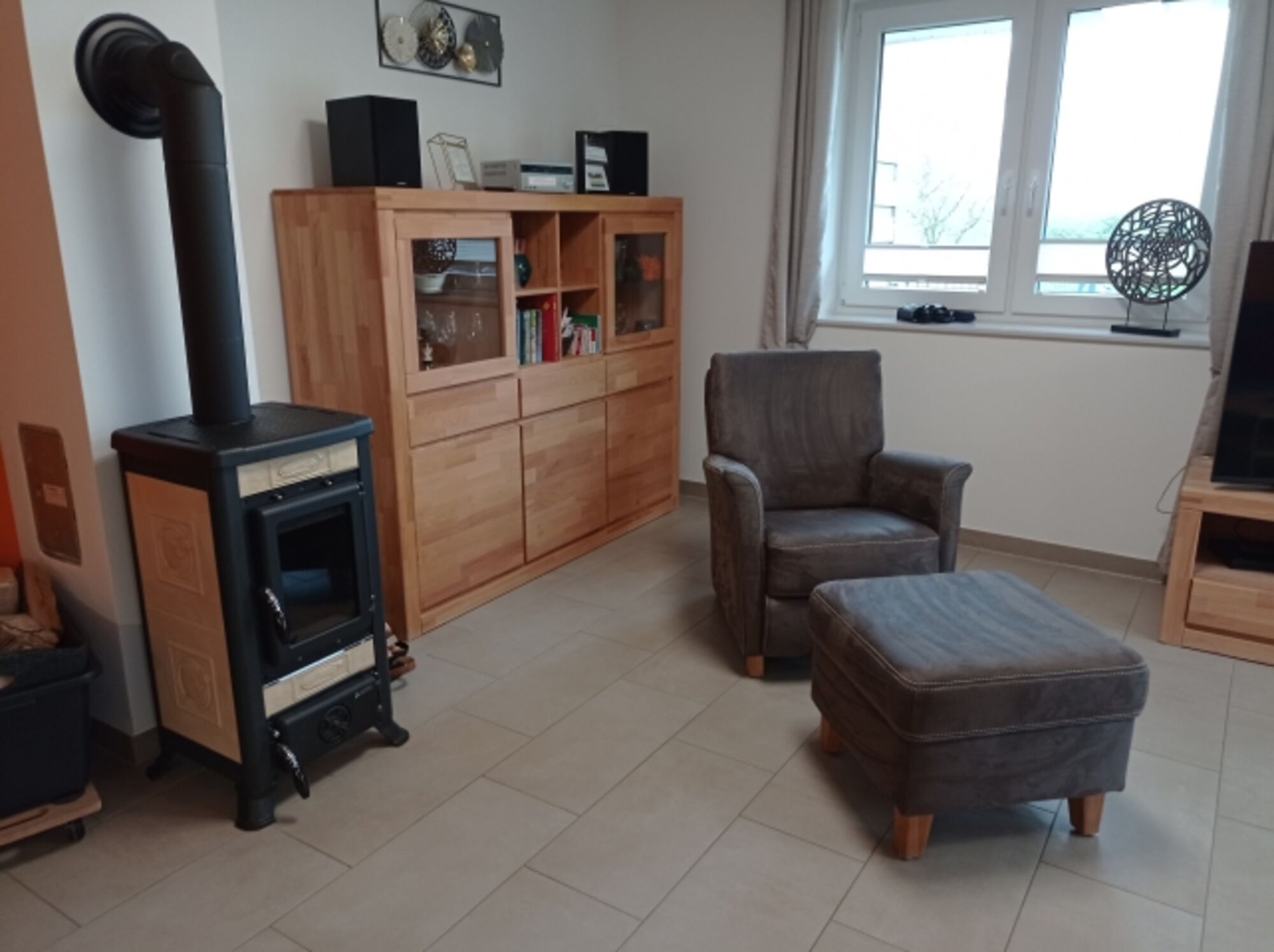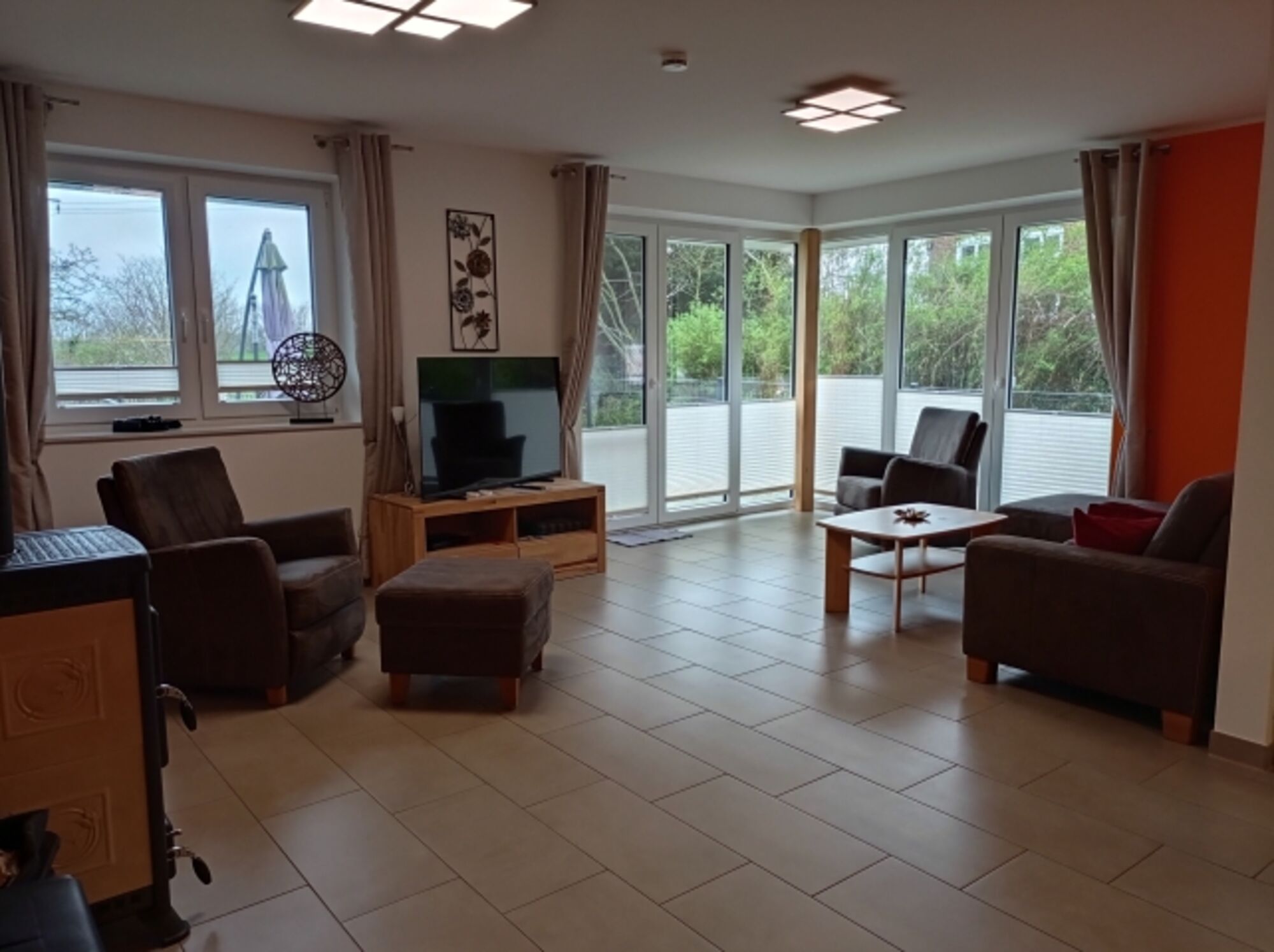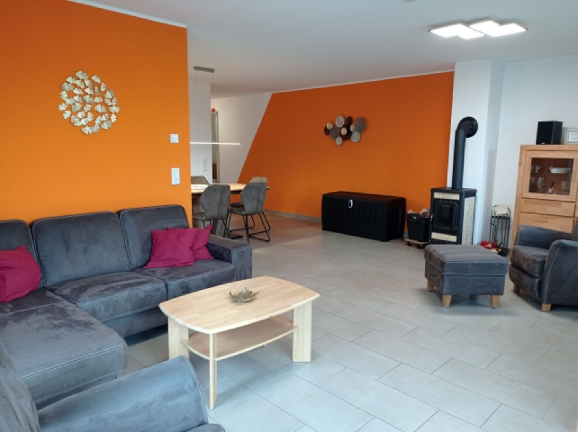 TV-Sat, HDTV Flachbildschirm, Blu-Ray-Player, DVD bzw. Blu-Ray-Filme, Hi-Fi-Anlage mit Bluetooth, CD-Player, CD´s, Bücher, Kaminofen, Eckcouch, Sessel