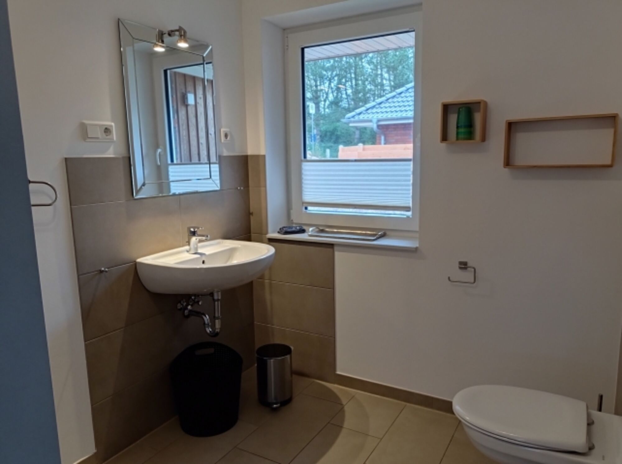 Fußbodenheizung, Plissees, Fliegengitter Waschbecken, Spiegel, Fenster im Bad