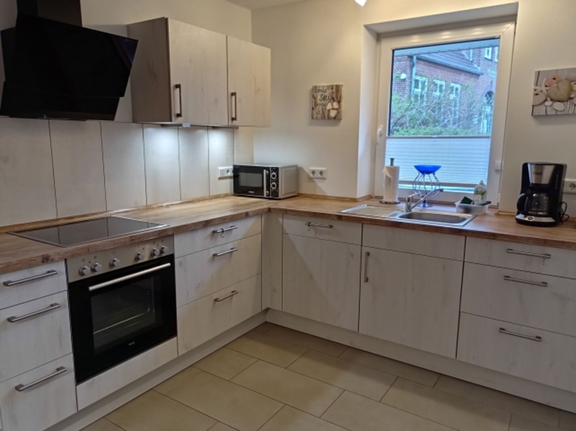 4-Platten Herd, Cerankochfeld, Dunstabzugshaube, Kühlschrank mit Gefrierfach, Eierkocher, Mixer, Korkenzieher / Flaschenöffner, Geschirrhandtücher, Mülltüten, Essplatz in der Küche