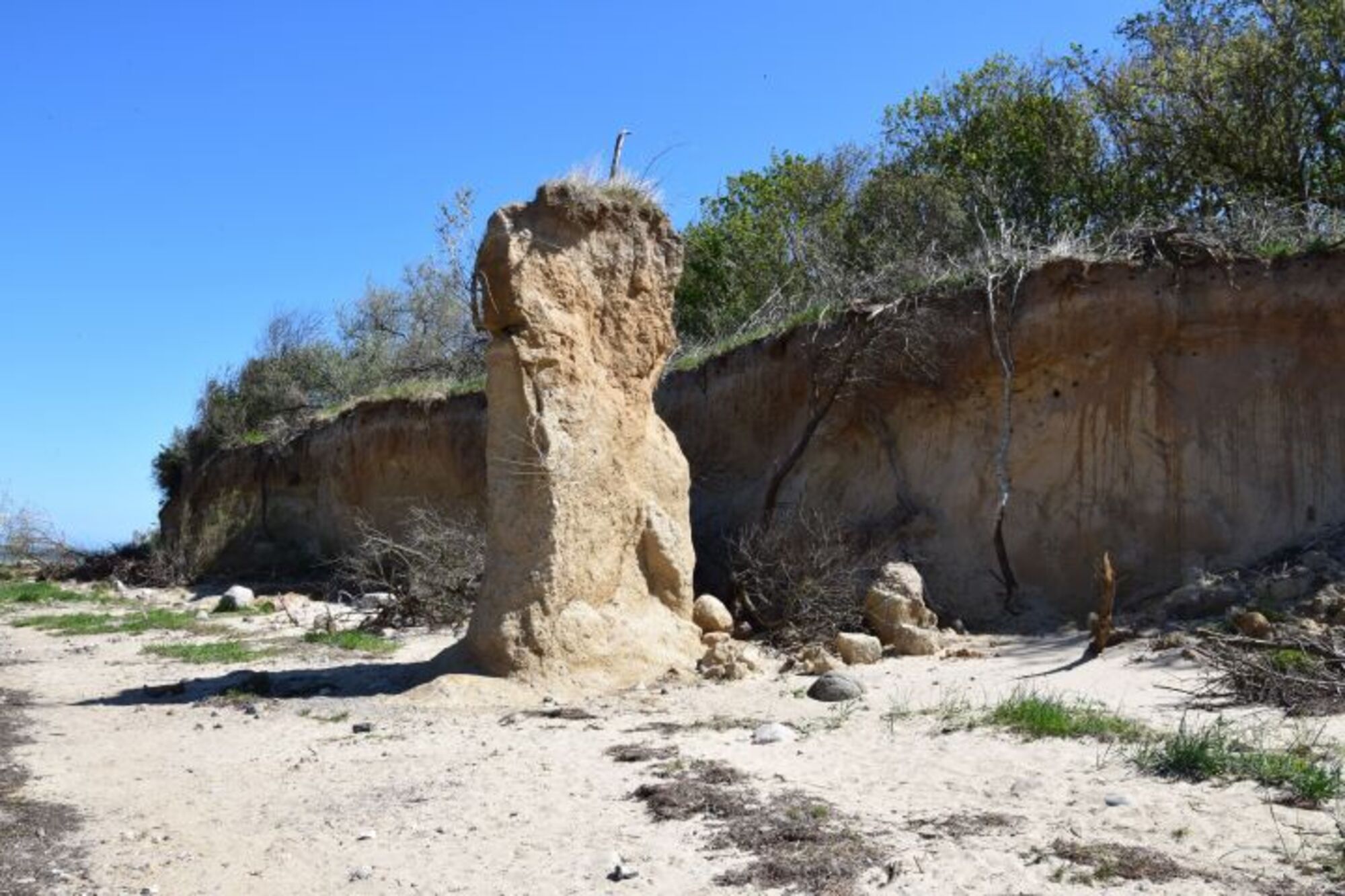 Schöner, naher Naturstrand mit Flachwasserbereich, Strandkiosk, Kite-Surfschule und Steilküste.