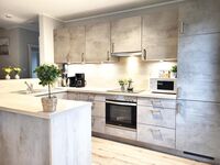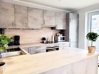Diele mit Garderobe, Duschbad mit WC, großzügiger Wohn-/Essbereich, Smart-Sat-TV, offene Küche, Terrasse. Die Küche ist mit Geschirrspüler, Mikrowelle, Wasserkocher, Eierkocher, Toaster etc. ausgestattet. Hauswirtschaftsraum mit Waschmaschine und Trockner.