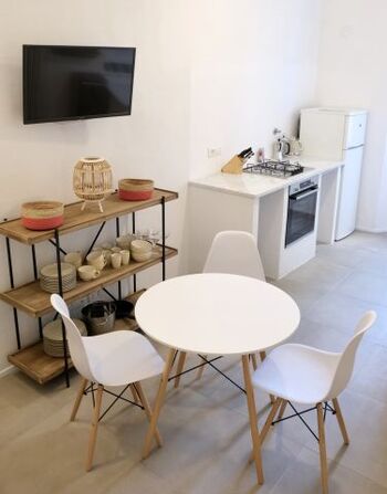 4-Platten Herd, Gasofen / Gasherd, Kühlschrank mit Gefrierfach, Korkenzieher / Flaschenöffner, Geschirrhandtücher, Essplatz in der Küche, TV in der Küche
