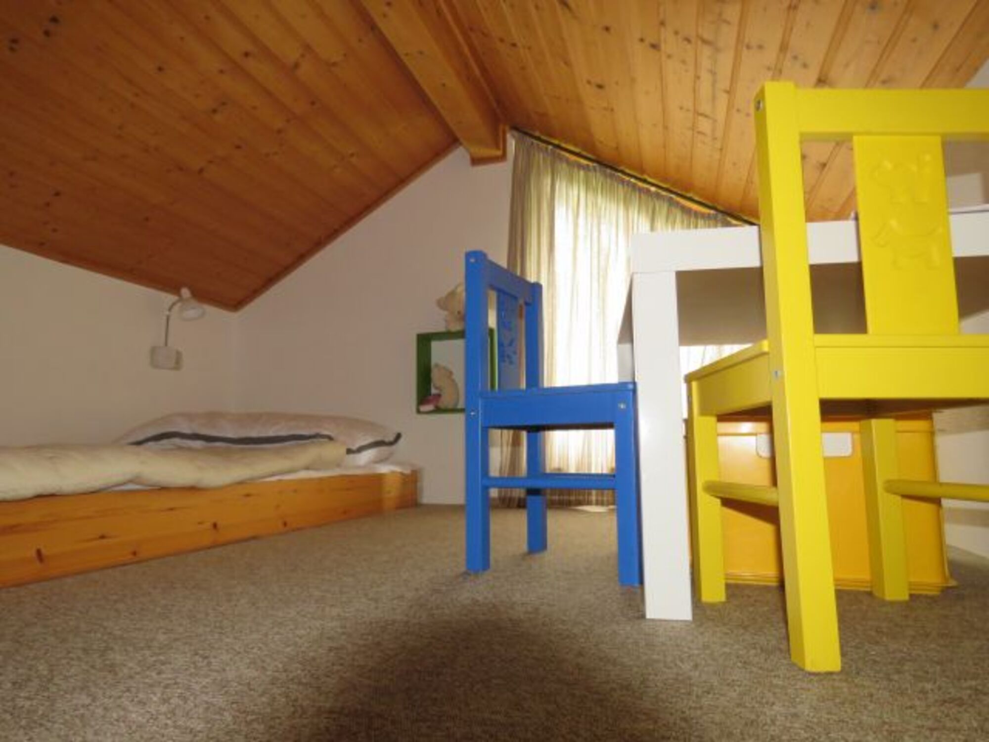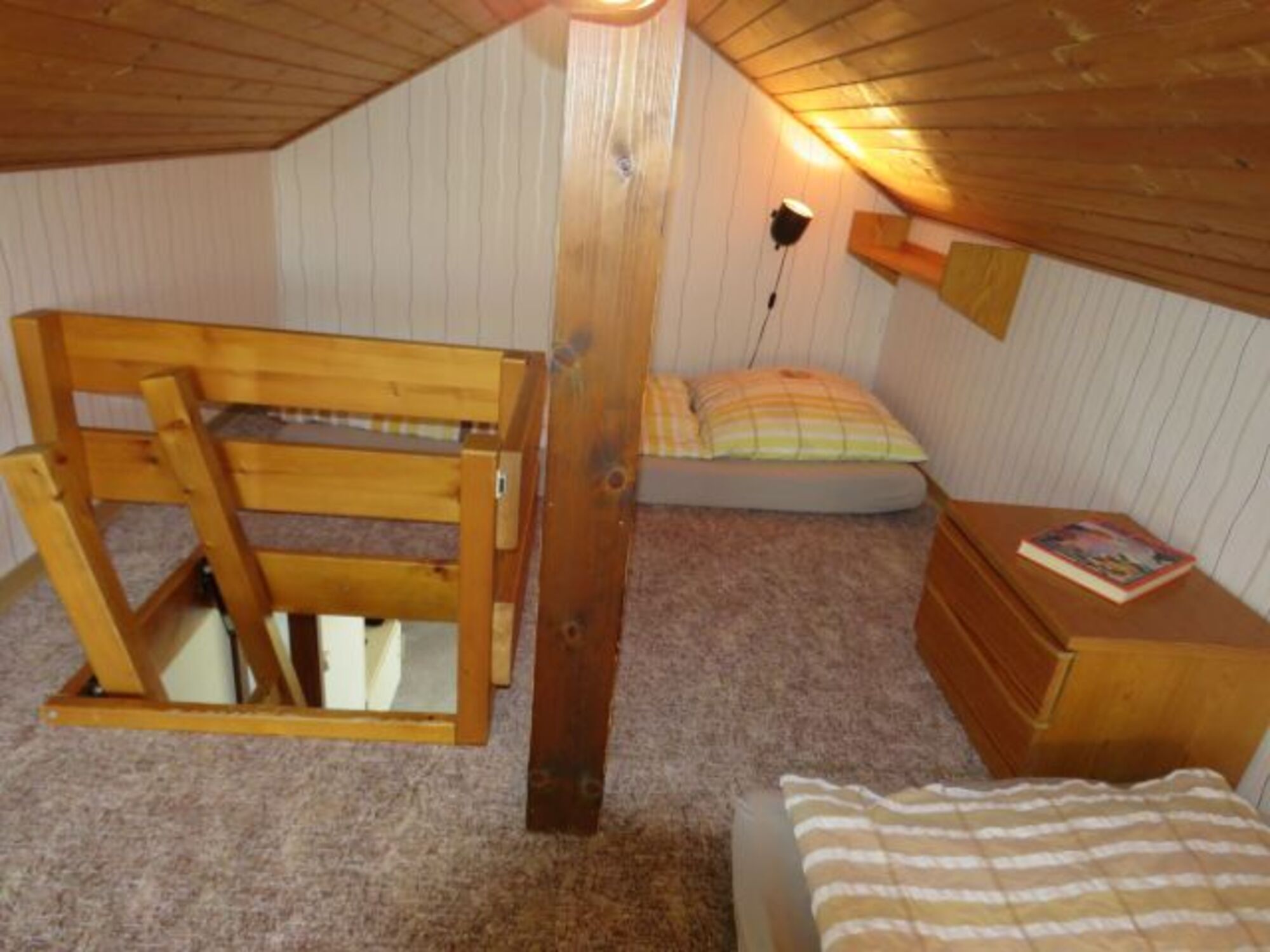 Ein bis zwei weitere Schlafplätze auf Matratzen befinden sich im Dachbereich in Form einer großzügigen Dachkoje die über eine Leiter zu erreichen ist. Einzelbett, Kommode, Leselampe am Bett