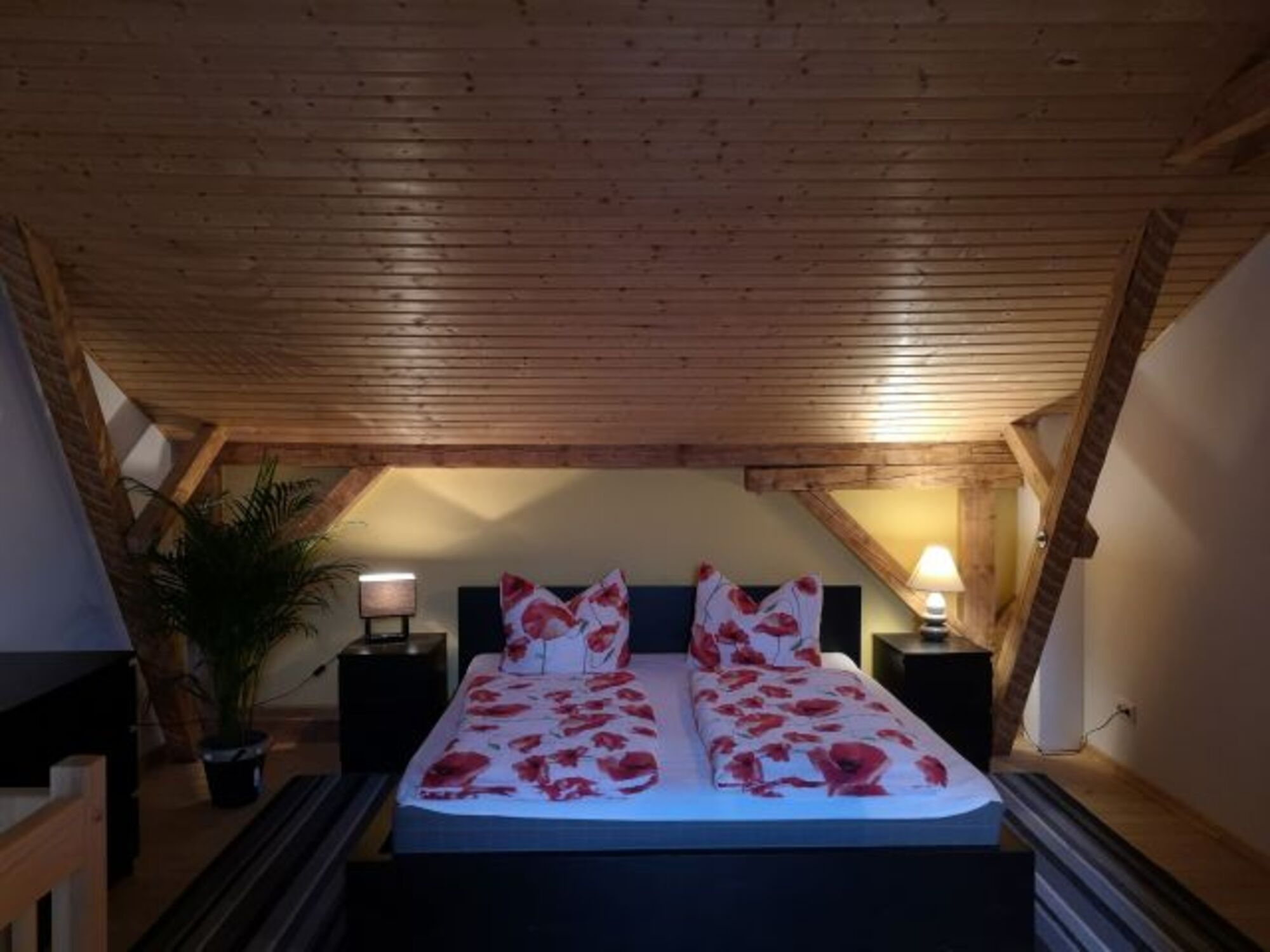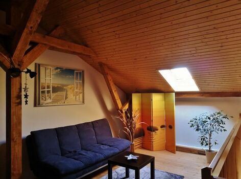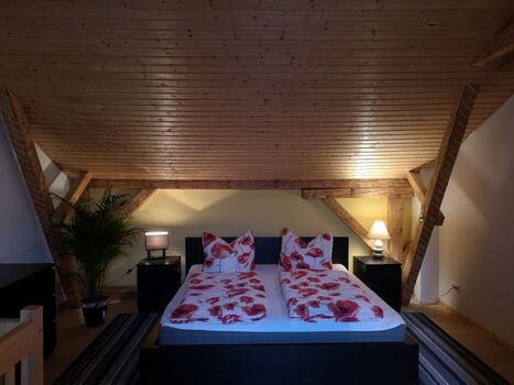 Über eine Holztreppe gelangen Sie nach oben in den gemütlichen Schlafbereich mit großem Bett (180x200), Schlafcouch (120x180), Kleiderschrank, Sideboard und Flachbildfernseher.