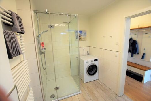 Das Bad mit Dusche/ WC ist zusätzlich mit einem Waschtisch ausgestattet, welcher für viel Ablagefläche auch im Badezimmer sorgt. Deckenspots und ein Handtuchwärmer ergänzen die moderne Einrichtung.