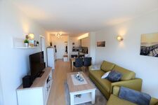 Der großzügige Wohn- und Essbereich bietet durch seine großen Terrassentüren nicht nur direkten Zugang zum Balkon, sondern auch Meerblick und viel Tageslicht.