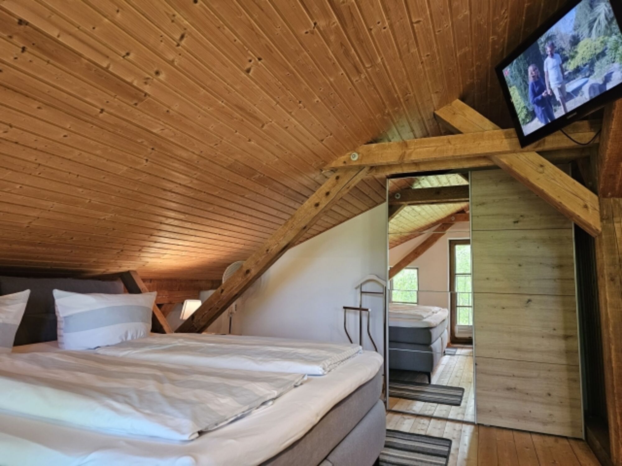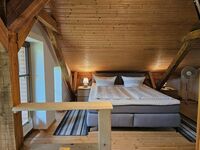 Über eine Holztreppe gelangen Sie nach oben in den gemütlichen Schlafbereich mit einem gemütlichen Boxspringbett (180x200), Kleiderschrank, Sideboard und Flachbildfernseher.