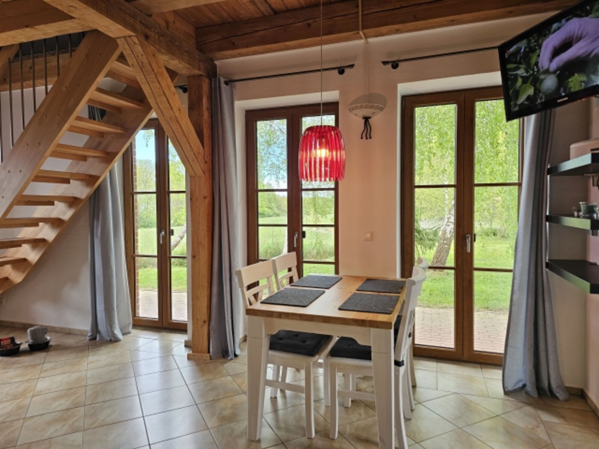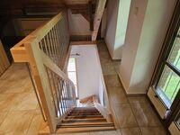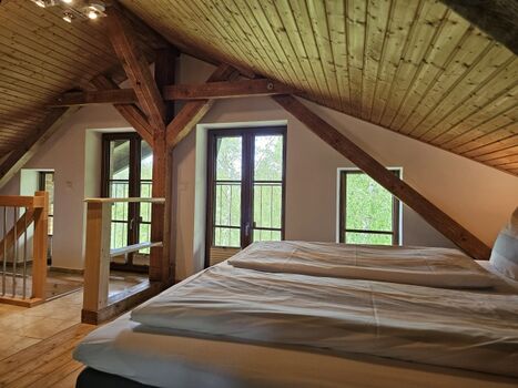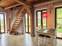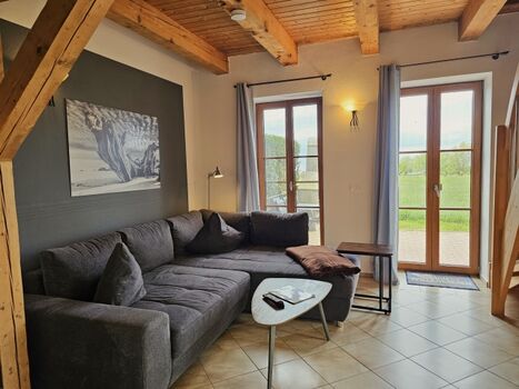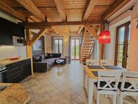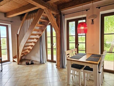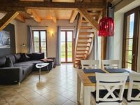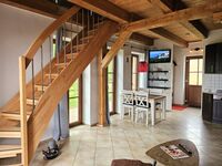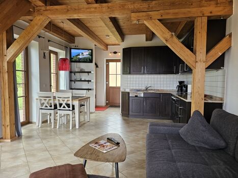 Die offene Balkendecke und die beiden Fensterfronten schaffen ein lichtdurchflutetes Raumerlebnis. Im Erdgeschoss erwartet Sie ein gemütlicher Wohn-Essbereich mit großer Eck-Schlafcouch (180x200) und Flachbildfernseher, dazu eine vollausgestattete Küche und ein Bad mit Dusche.