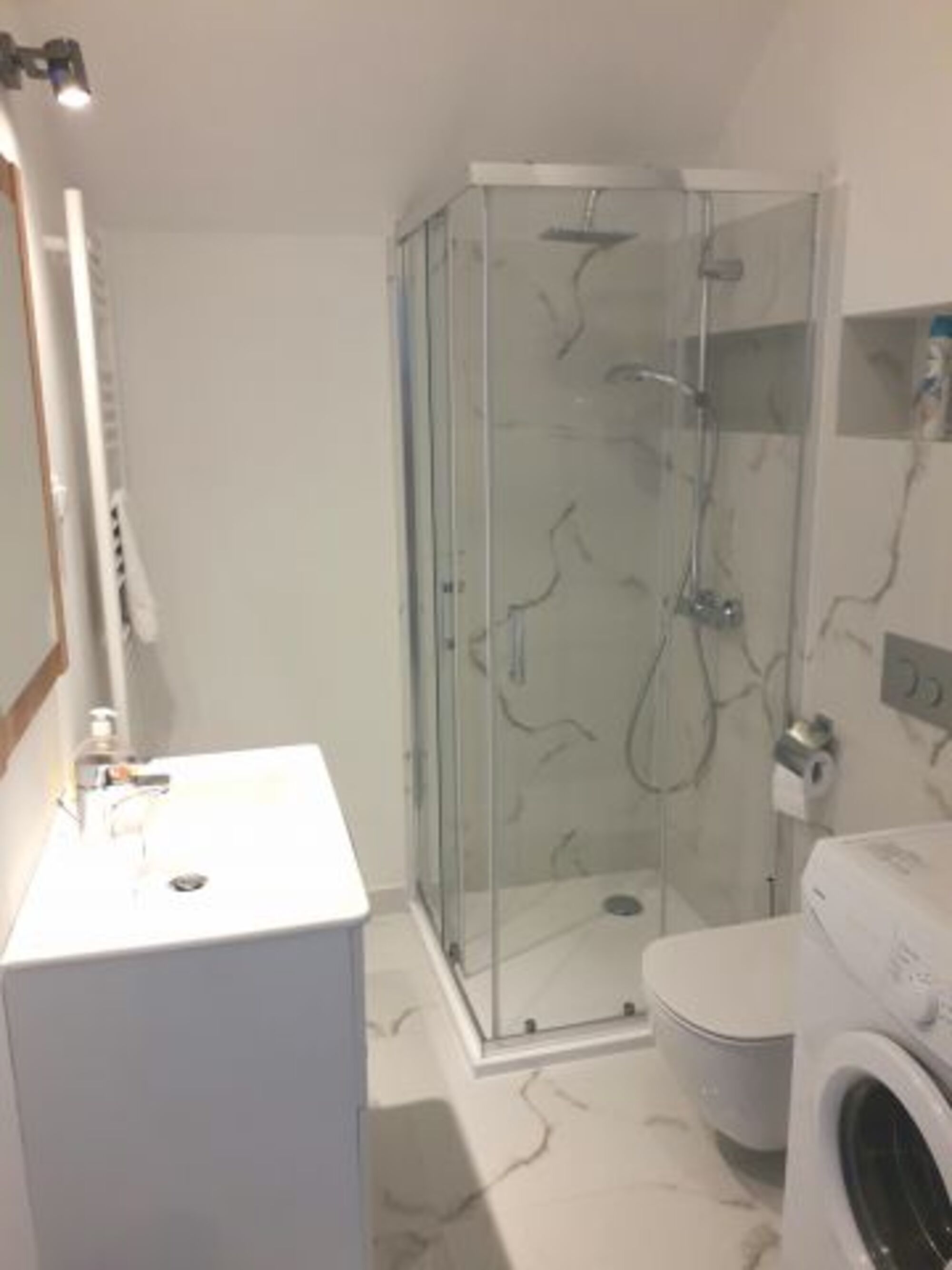 Waschbecken, Regendusche, Spiegel