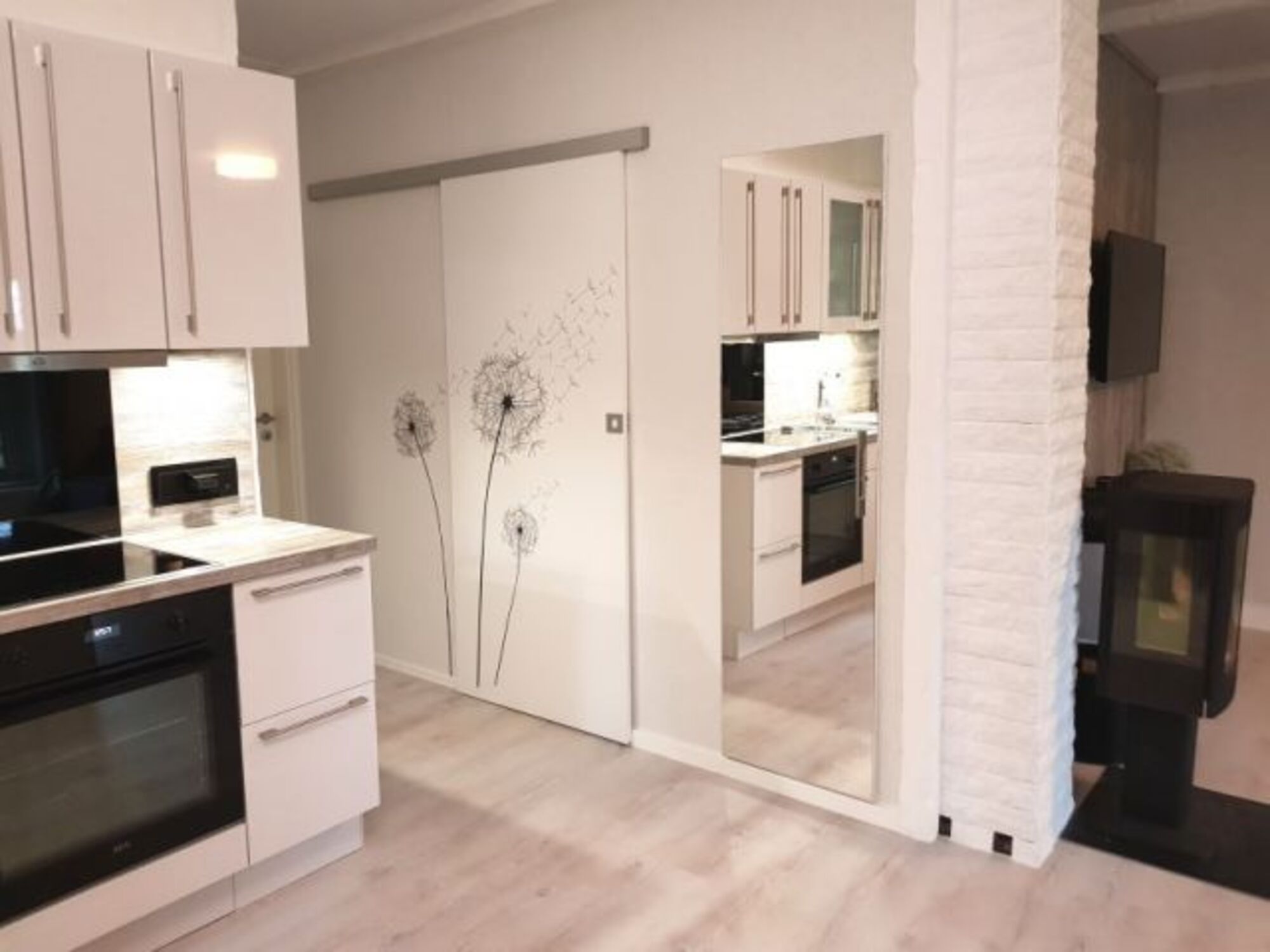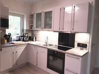 4-Platten Herd, Induktionsherd, Dunstabzugshaube, Kühlschrank mit Gefrierfach, Mixer, Korkenzieher / Flaschenöffner, Geschirrhandtücher, Mülltüten