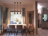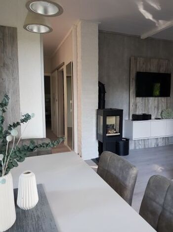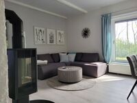 Das modern eingerichtete, komfortabel ausgestattete Ferienhaus im Bungalowstil (ebenerdig) mit 58qm Wohnfläche und überdachter Terrasse teilt sich auf in ein helles Wohn,-/Esszimmer mit Kamin, ein Schlafzimmer mit einem 1.60m-Bruno-Boxspringbett, ein weiteres Schlafzimmer mit zwei Stauraum-Einzelbetten und kleinem Schreibtisch, einem Tageslicht-Bad mit Dusche, einer komplett eingerichteten offenen Küche mit Kühlschrank, Spülmaschine, Induktionskochfeld, Backofen, Mikrowelle, Toaster und Küchengeräten und einem Hauswirtschaft-/Vorratsraum mit Waschmaschine. Das Ferienhaus wird mit einer Gas-Zentralheizung beheizt und ist ganzjährig nutzbar.