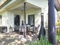 Der überdachten Terrasse schließt sich ein kleiner zusätzlich eingezäunter Garten-Bereich an. Hier haben Sie Ihre Liebsten gut im Blick, können auf den Sonnenliegen relaxen, grillen oder in Ruhe romantische Abende am Außenkamin verbringen... Oder Sie entspannen in der gemütlichen Fass-Sauna mit Holzofen.