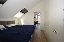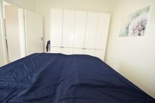 Entspannte Urlaubsnächte sind im komfortablen Schlafzimmer der Wohnung garantiert. Ein großer Schrank sorgt für reichlich Stauraum und das große Doppelbett für einen guten Schlaf. Das Duschbad lässt ebenfalls keine Wünsche offen. Die Dusche ist bodentief und lässt sich mit einer Glastür verschließen. Helle Fliesen sorgen für einen modernen Gesamteindruck. Deckenspots, ein Waschtisch mit großem Spiegel und ein Fön sind hier ebenso vorhanden wie ein Handtuchwärmer.