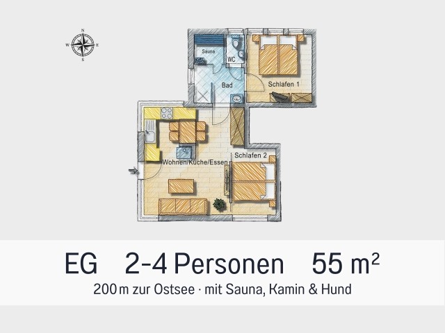 Ferienwohnung Wind – Hund willkommen, 200 m zur Ostsee, Sauna & Kamin