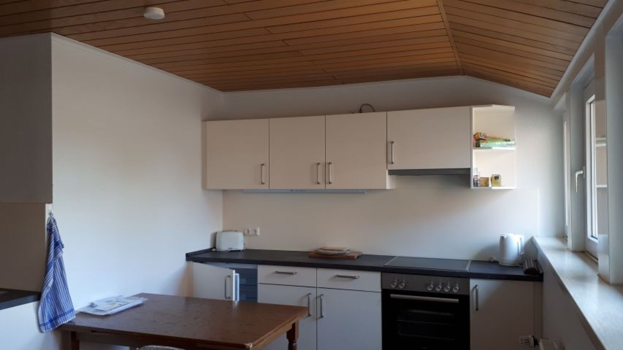 Cerankochfeld, Dunstabzugshaube, Kühlschrank mit Gefrierfach, Korkenzieher / Flaschenöffner, Geschirrhandtücher, Mülltüten, Essplatz in der Küche