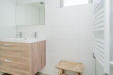 Das neue, moderne Badezimmer ist mit einer schönen Regendusche und einem Doppelwaschbecken ausgestattet. Es gibt eine separate Toilette.