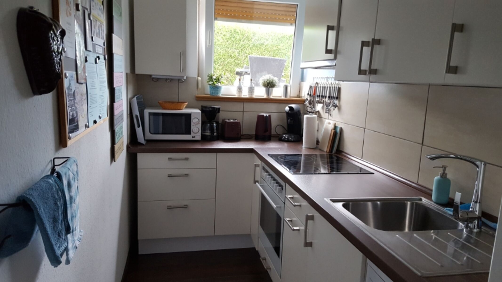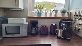 Cerankochfeld, Dunstabzugshaube, Kühlschrank mit Gefrierfach, Kaffeevollautomat, Senseo-Kaffeeautomat, Mixer, Korkenzieher / Flaschenöffner, Gewürze (Salz, Pfeffer, Zucker), Öl / Essig, Geschirrhandtücher, Mülltüten