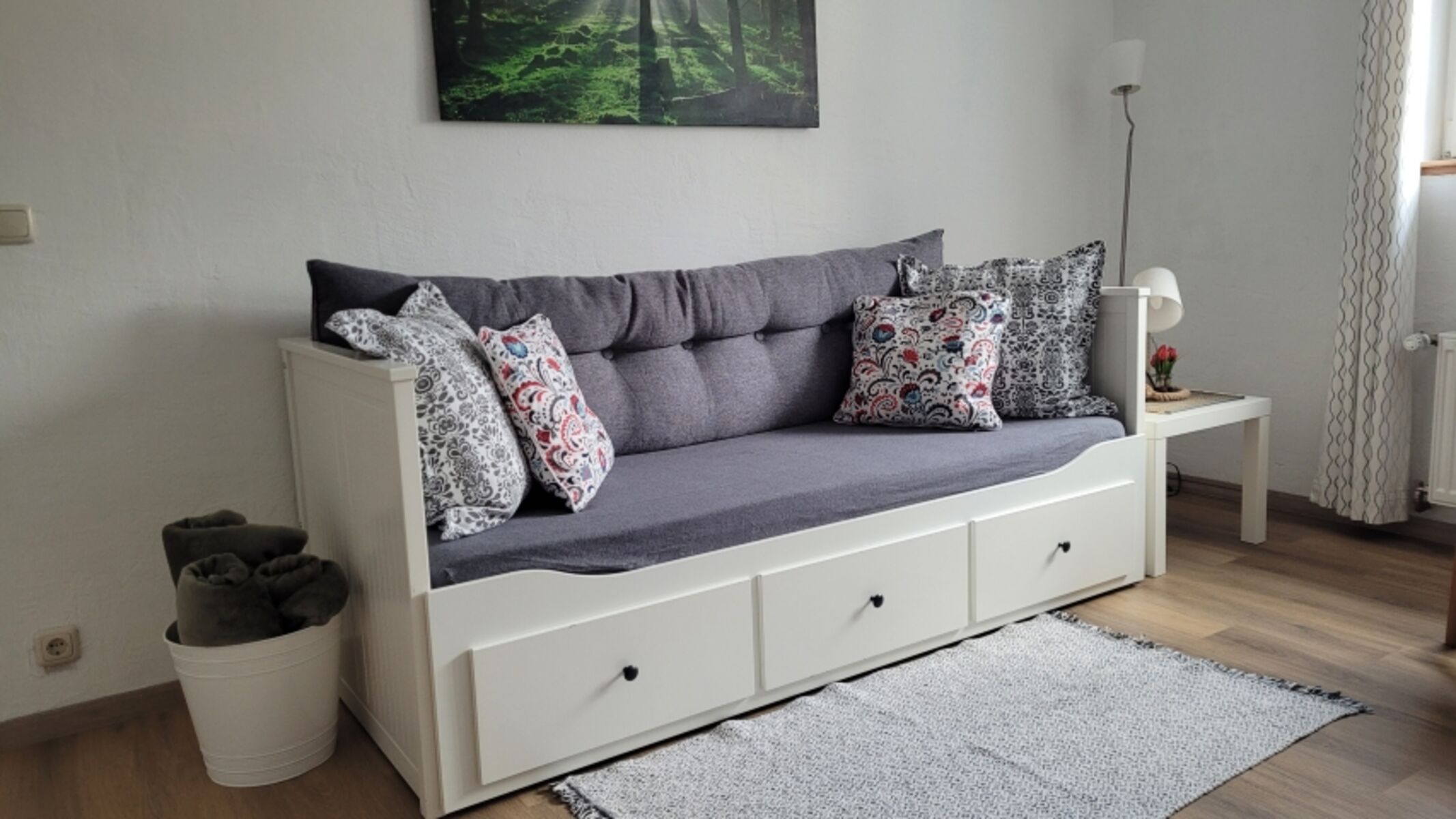 Die Bettdecken sind in Komfortgröße (220x155). Babybett auf Anfrage. Doppelbett 1,80 x 2,00m, Kommode, Spiegel, Leselampe am Bett