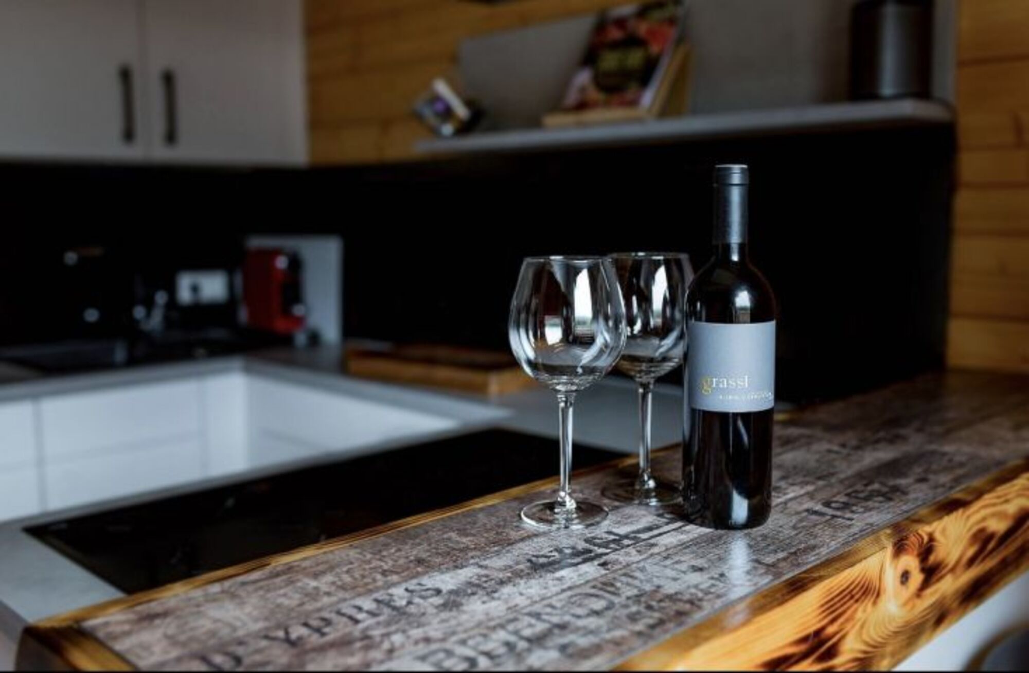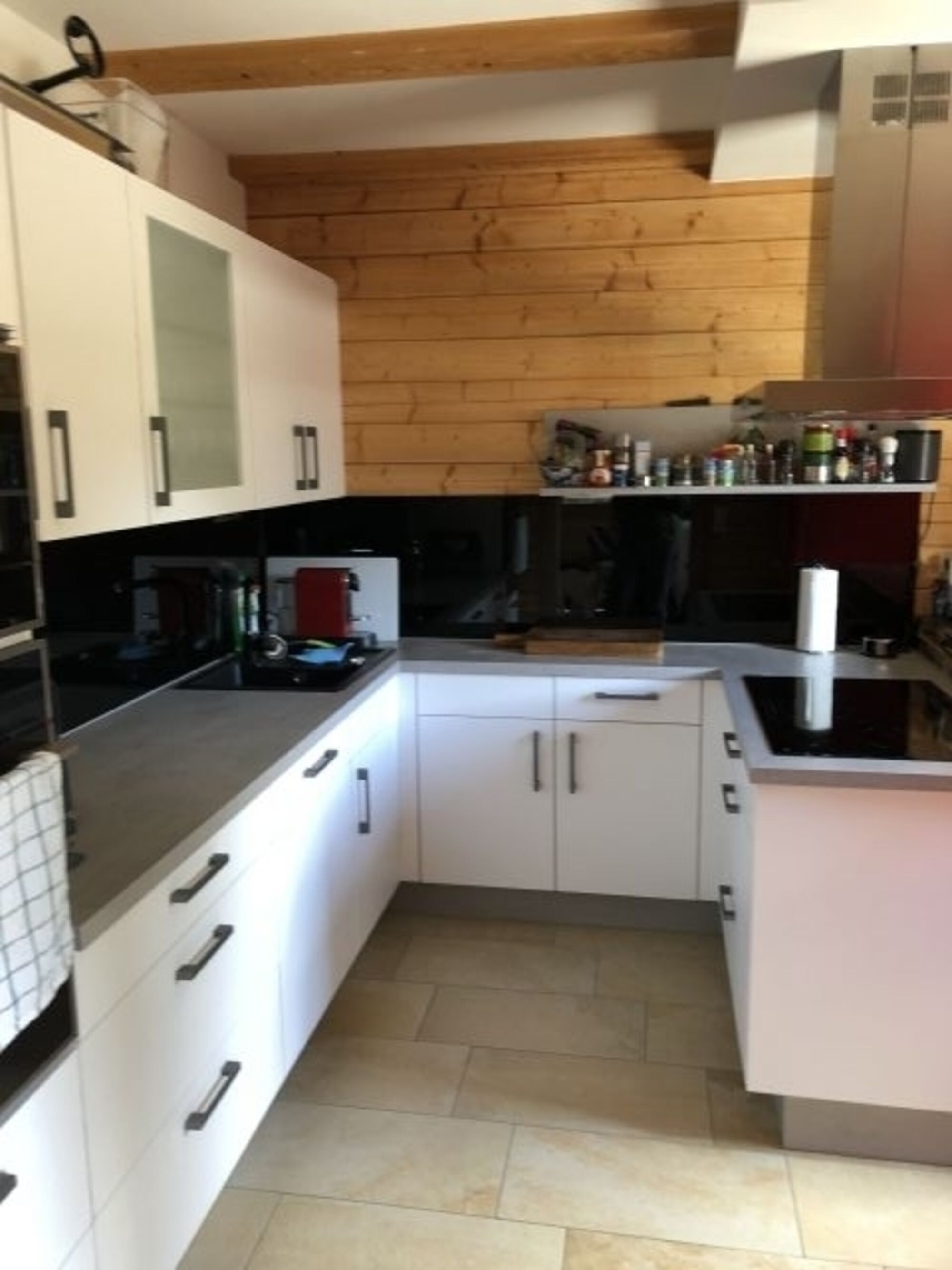 4-Platten Herd, Cerankochfeld, Induktionsherd, Dunstabzugshaube, Kühlschrank mit Gefrierfach, Gefrierschrank, Kaffeevollautomat, Nespresso-Automat, Eierkocher, Küchenmaschine, Mixer, Korkenzieher / Flaschenöffner, Gewürze (Salz, Pfeffer, Zucker), Geschirrhandtücher, Mülltüten, Essplatz in der Küche