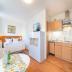 Die offene Küchenzeile, ausgestattet mit 2-Platten-Herd, Kühlschrank, Mikrowelle mit Grillfunktion und vielen weiteren Küchenutensilien.
