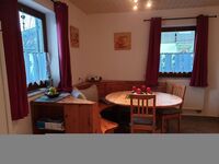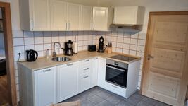 Cerankochfeld, Dunstabzugshaube, Gefrierschrank, Senseo-Kaffeeautomat, Eierkocher, Mixer, Korkenzieher / Flaschenöffner, Gewürze (Salz, Pfeffer, Zucker), Öl / Essig, Geschirrhandtücher, Mülltüten, Essplatz in der Küche
