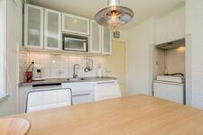 In der offenen Küche mit einer Essgruppe für vier Personen finden Sie u.a. eine 4-Brenner-Gaskochplatte, eine Spülmaschine, einen Kühlschrank mit Gefrierfach und eine Kombi-Mikrowelle.