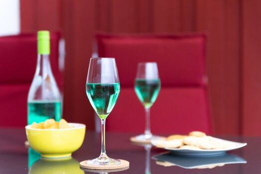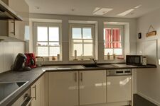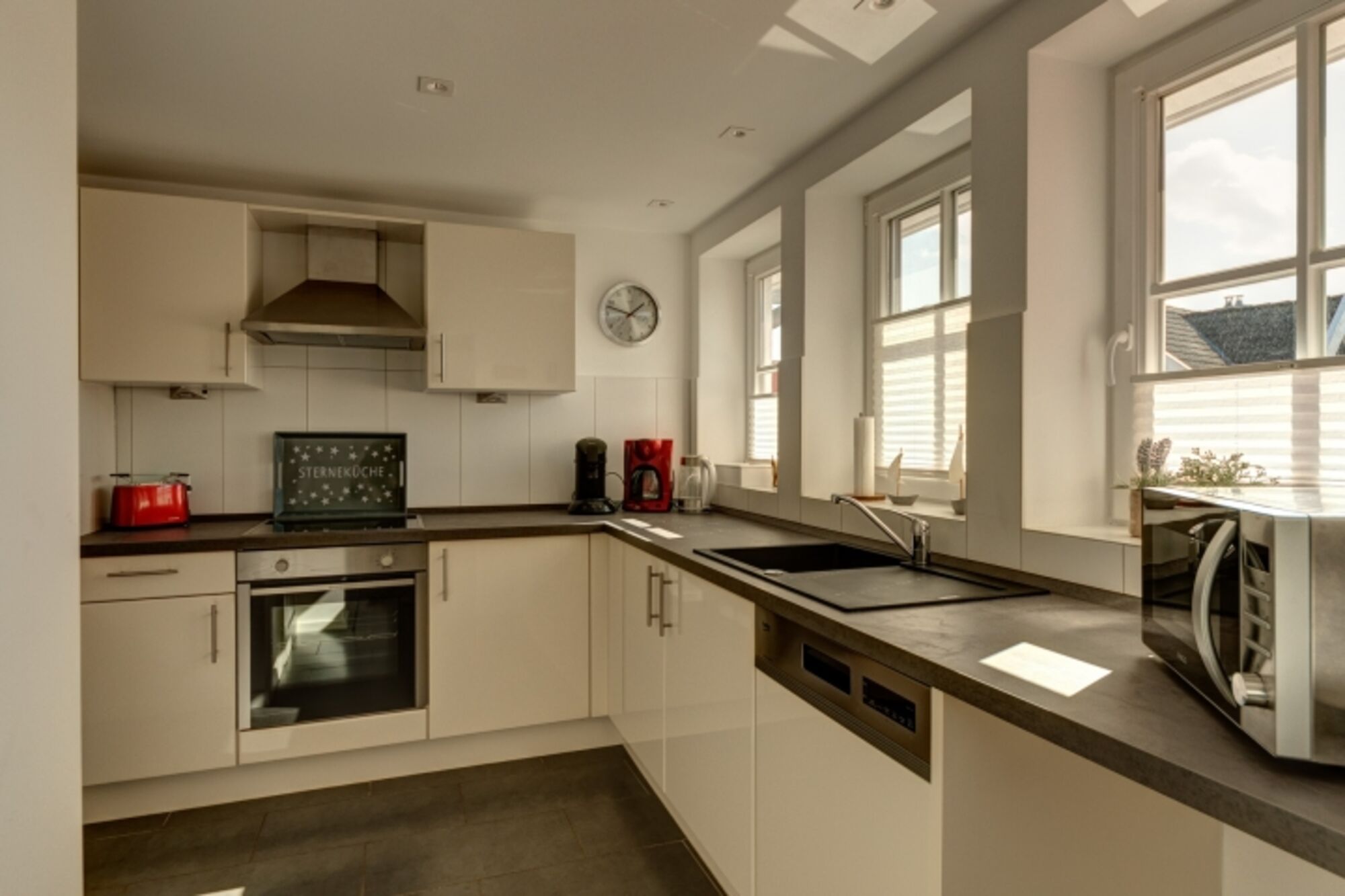 Induktionsherd, Dunstabzugshaube, Kühlschrank mit Gefrierfach, Eierkocher, Mixer, Korkenzieher / Flaschenöffner, Gewürze (Salz, Pfeffer, Zucker), Geschirrhandtücher, Mülltüten