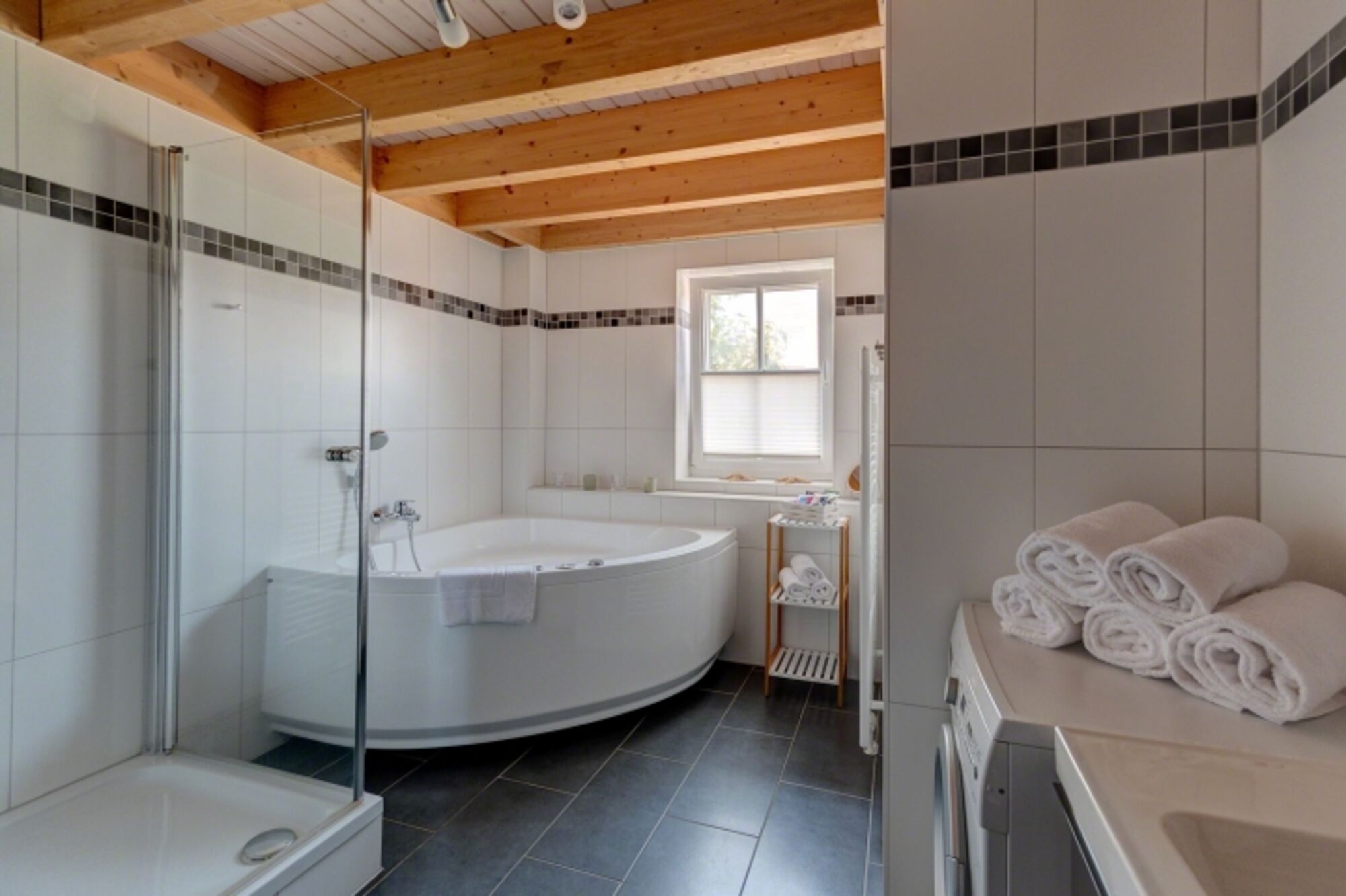 Badewanne mit Whirlpool, Waschbecken, Kosmetiktücher, Spiegel, Fenster im Bad