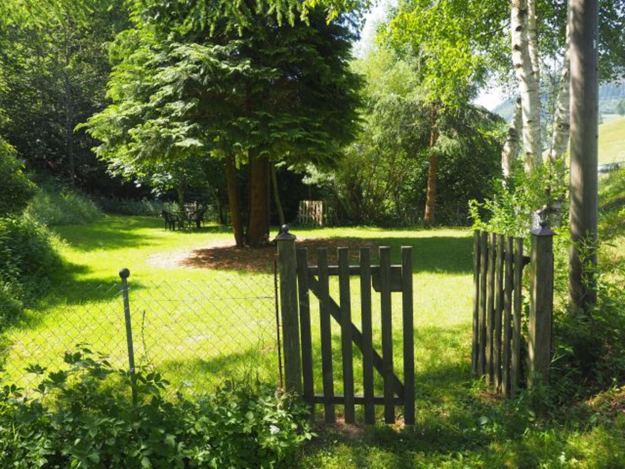 Zum Haus gehört ein weitläufiger, rundum eingezäunter Garten mit Spiel- und Liegewiese und einem direkten Zugang zum angrenzenden Belchenbach.