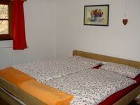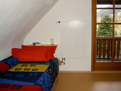 Im Obergeschoss gibt es ein großes Schlafzimmer mit Doppelbett und einem Kinderbett, zwei Zimmer mit je zwei Einzelbetten, ein Zimmer ( Durchgangszimmer zum Balkon ) mit einem Einzelbett und ein Bad mit zwei Waschbecken, Dusche und WC. Vom großen Balkon aus genießen Sie einen herrlichen Blick ins Tal.