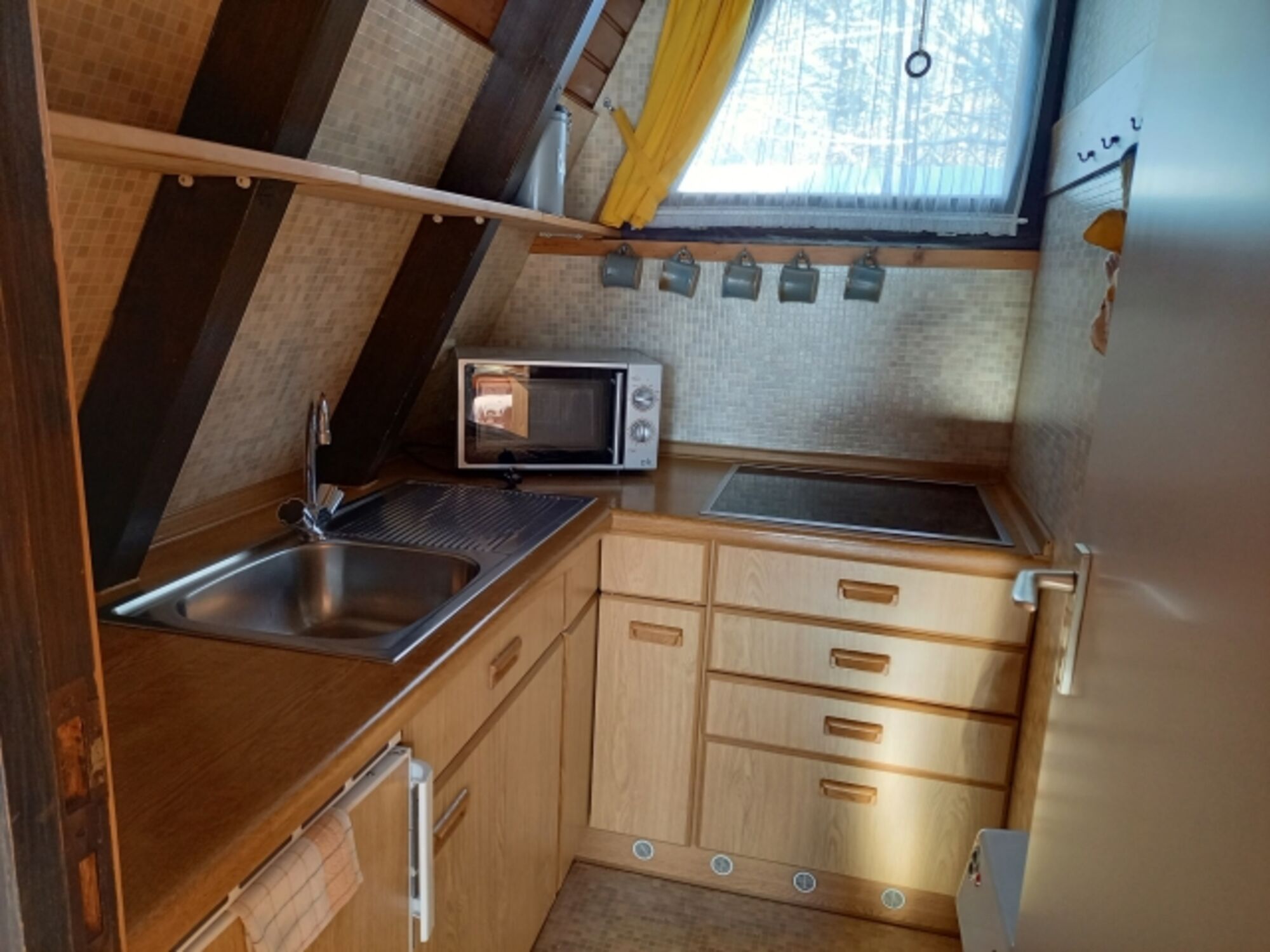 Kleine Einbauküche mit Cerankochfeld , Kaffeemaschine, Mikrowelle, Kühlschrank mit Gefrierfach, Toaster, Eierkocher, Wasserkocher