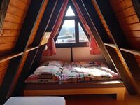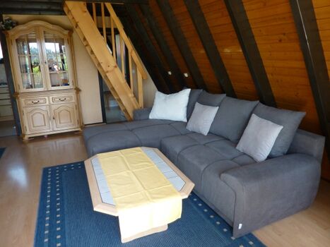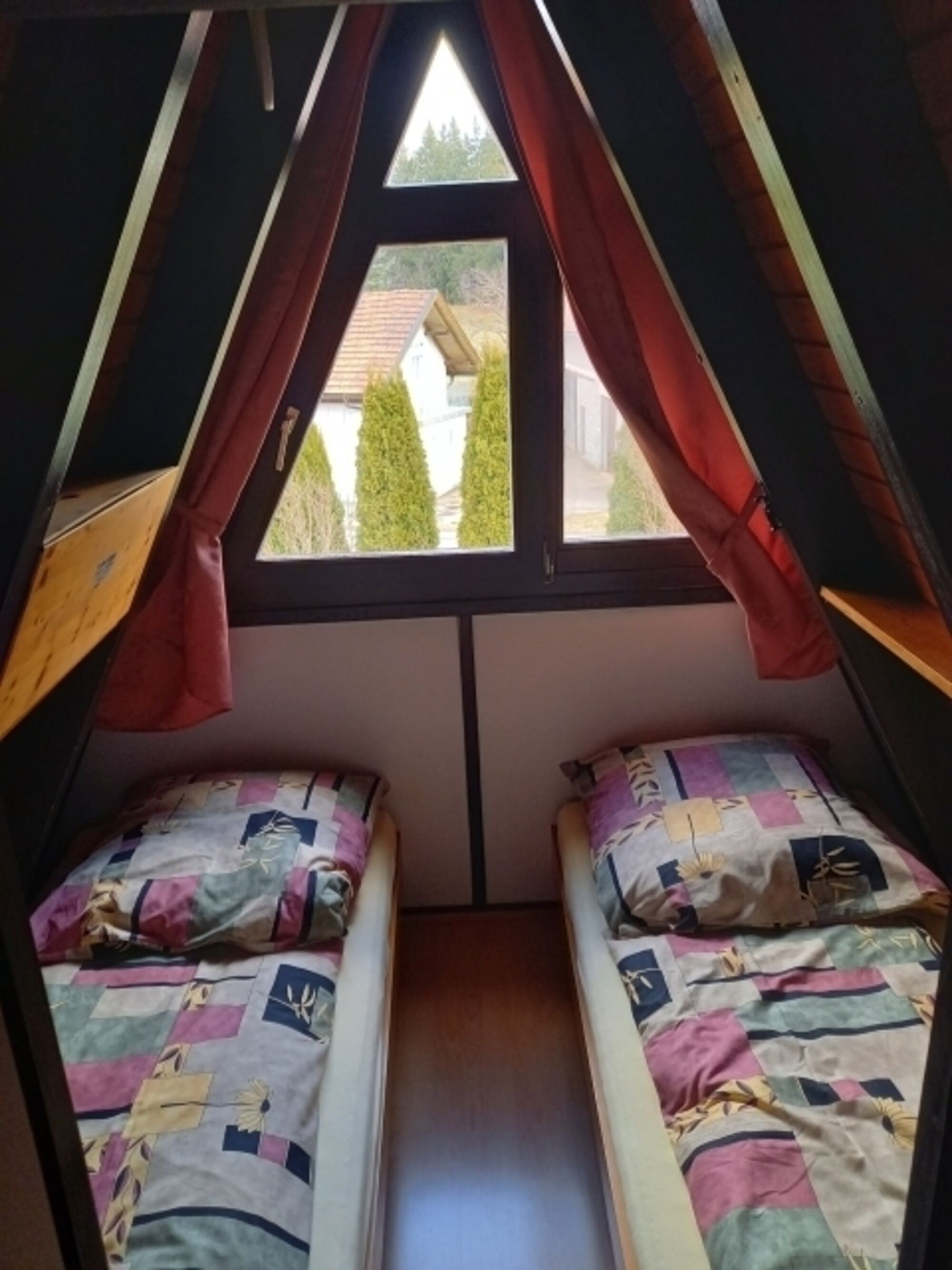 Die beiden Schlafzimmer im OG sind mit einer steilen Treppe vom Wohn-Eßzimmer zu erreichen.