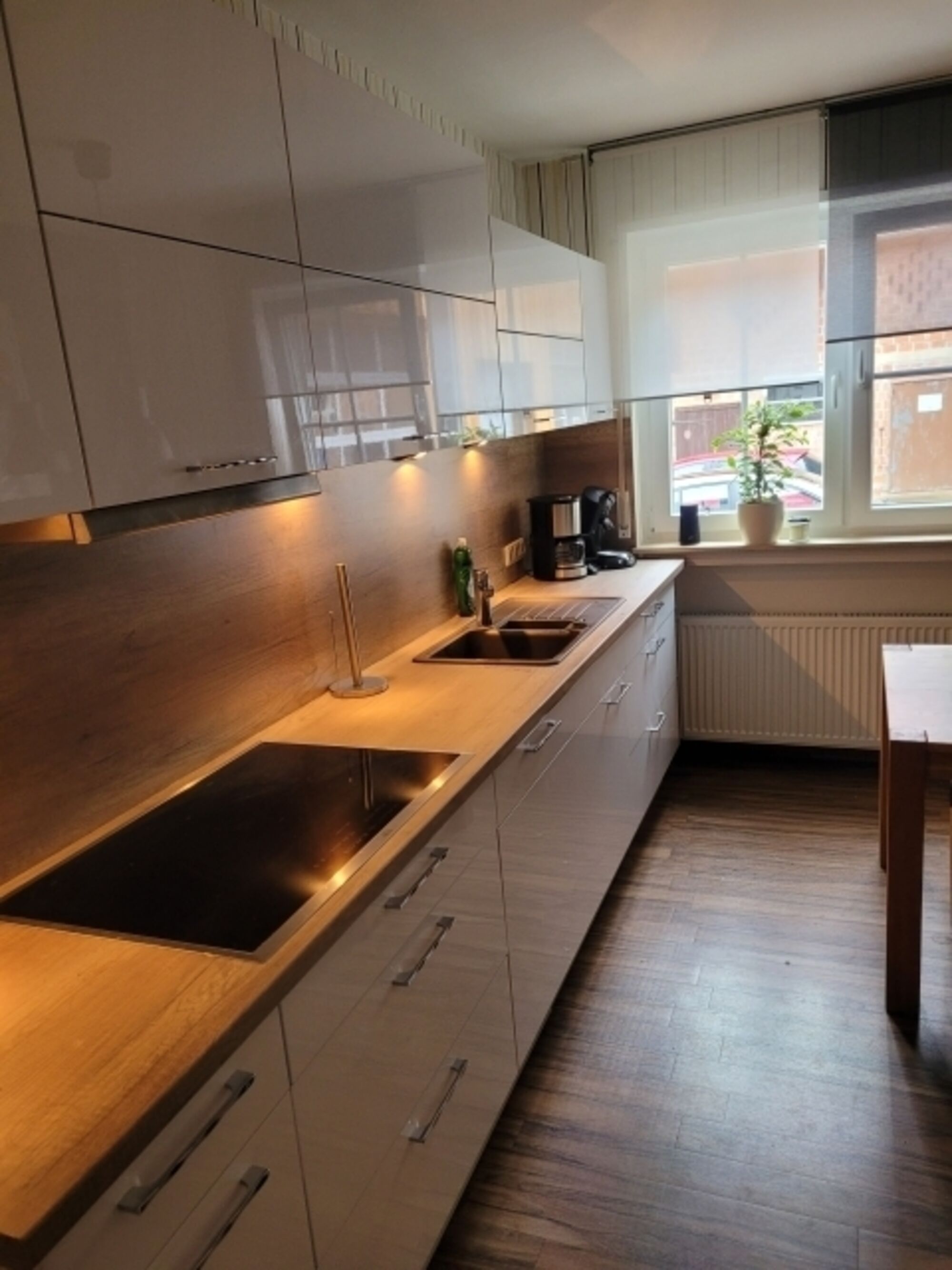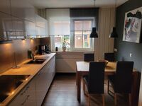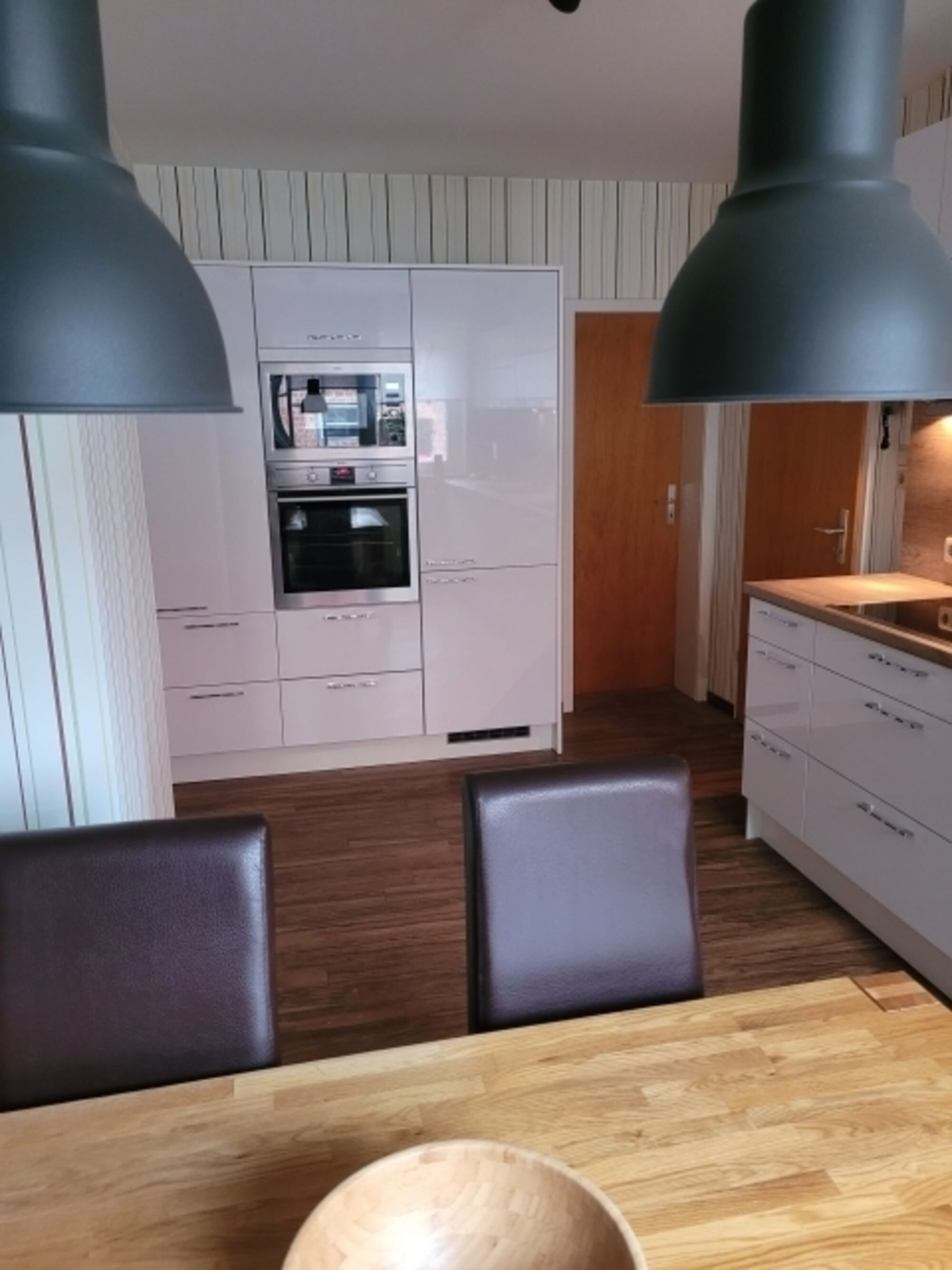 Die Einbauküche mit Esstisch und Stühlen ist mit allen gängigen Geräte wie Induktionskochfeld, autarker Backofen, Mikrowelle, Kühlschrank, Geschirrspüler, Kaffeevollautomat, auf Wunsch zusätzlich Kaffeemaschine oder Senseo, Toaster und Wasserkocher ausgestattet. Auch eine Grundaustattung an Backformen und Mixer sind vorhanden.